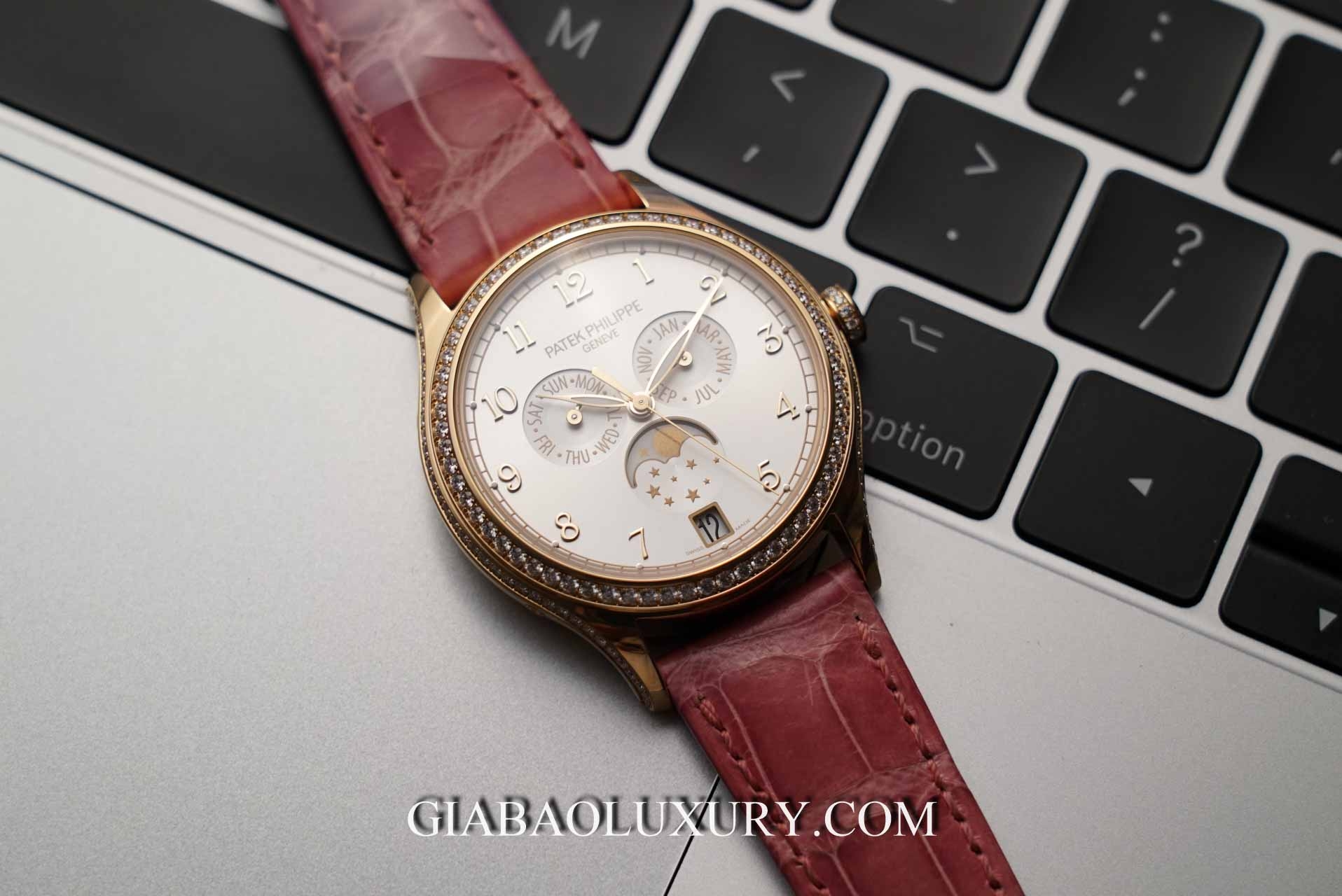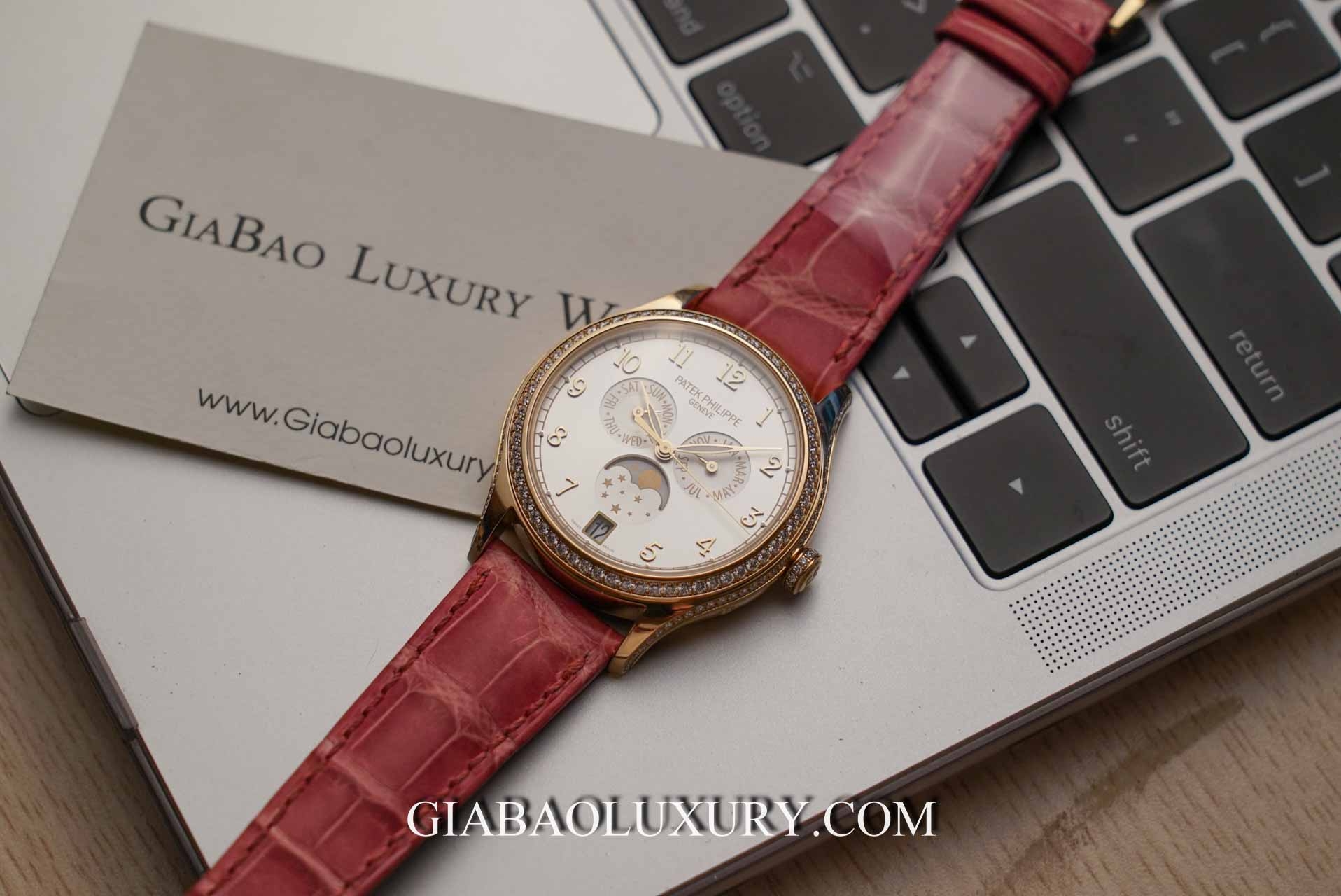 Thậm chí, chi tiết núm chỉnh giờ nhỏ gọn cũng được tô điểm với 14 viên kim cương có kích thước nhỏ hơn (dự tính khoảng 0, 06 cara). Sự đỏm dáng và điệu đà của bộ vỏ khung tròn, cũng như sự nổi bật một cách trang nhã đến từ dây đeo với sắc hồng ấm áp nữ tính chính là điểm thu hút riêng biệt, mà nhà chế tác Patek Philippe dành cho mỗi quý cỗ với cỗ máy thời gian 4947R này.