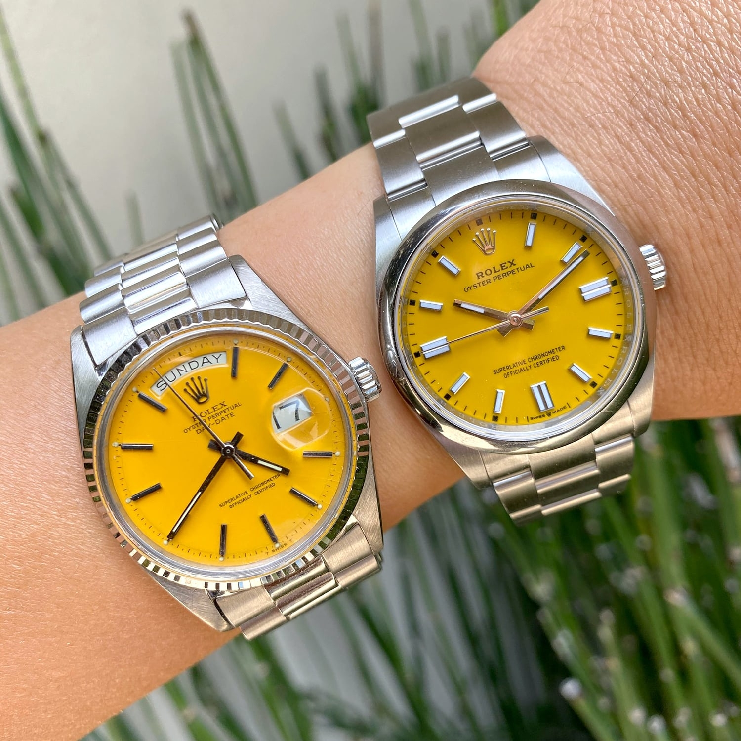 Mặc dù vậy, nếu như bạn thực sự tìm hiểu, bạn sẽ biết rằng những tông màu đó có nguồn gốc từ mặt số tráng men của dòng Day-Date, vốn xuất hiện từ những năm 1970. Những tông màu tươi sáng đó không phải tương đồng, mà là giống hệt với thiết kế đã xuất hiện gần 50 năm trước. Nếu không tin, bạn có thể nhìn vào bức ảnh ở trên.