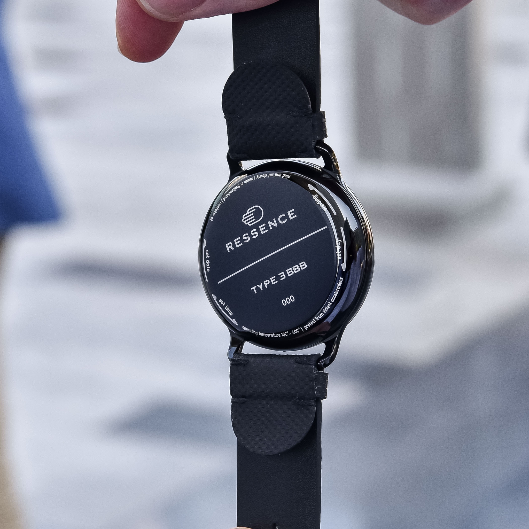 Để làm được điều đó, thương hiệu Ressence đã chuyển bộ phận này vào phía sau đồng hồ. Ví dụ ở đây, với mẫu đồng hồ Type 3 BBB, bạn chỉ cần xoay mặt kính phía sau (theo chỉ dẫn được in trên đáy) để có thể lên cót hoặc đặt thời gian cho đồng hồ.