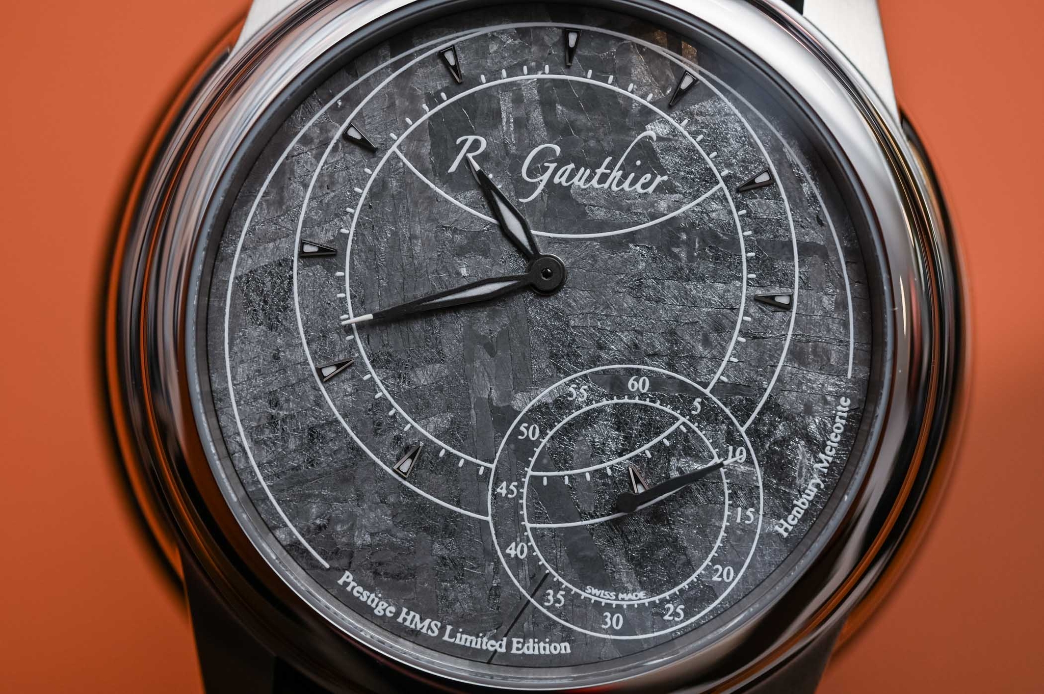 Mẫu đồng hồ ví dụ bên trên có mặt số làm từ hiên thạch Henbury Octahedrite bắt mắt là vậy, nhưng mặt sau của nó mới là chi tiết ăn điểm. Bộ máy Calibre 2206 HMS có một núm vặn đặt phẳng phía sau đồng hồ. Ở vị trí cơ bản, núm vặn dùng để lên cót. Khi được kéo ra một nấc, núm vặn dùng để điều chỉnh bộ kim. Ngay lúc điều chỉnh núm vặn, bạn cũng có cơ hội chiêm ngưỡng thấp thoáng cầu nối và chuyển động của các bánh răng đã được hoàn thiện đẹp mắt trên đồng hồ Romain Gauthier.