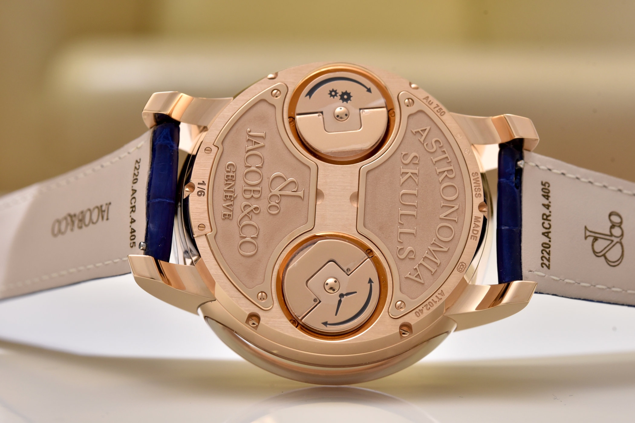 Đồng hồ Jacob & Co. Astronomia có 2 “chìa khoá" nằm phía mặt đáy đồng hồ. Người dùng sẽ bật bộ phận này lên để cài đặt thời gian và lên cót cho đồng hồ. Ví dụ là chiếc đồng hồ Astronomia Tourbillon Art Static 4 Skulls bạn có thể thấy bên trên hay chiếc Jacob & Co Fleurs De Jardin Rainbow đang có mặt tại Gia Bảo Luxury, núm vặn truyền thống đã không còn.