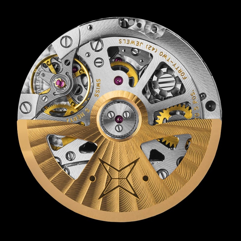 Giống như Arceau L'Heure De La Lune (cũng sử dụng máy nền Vaucher), Arceau Le Temps Voyageur được xây dựng theo công thức tương tự. Mặt số phụ thể hiện giờ và phút chạy quanh mặt số. Thông qua nút bấm ở góc 8 giờ, mặt số phụ sẽ tiến lên từng bậc, với mũi tên nhỏ màu đỏ sẽ chỉ tới thành phố tương ứng. Chức năng phức tạp này được thực hiện thông qua bộ máy Hermès Calibre H1837 tự động kèm Chronode. Không khó để hiểu, Vaucher Manufacture Fleurier SA là tác giả của bộ máy cơ sở khi Hermes có 25% cổ phần chiến lược.![]()