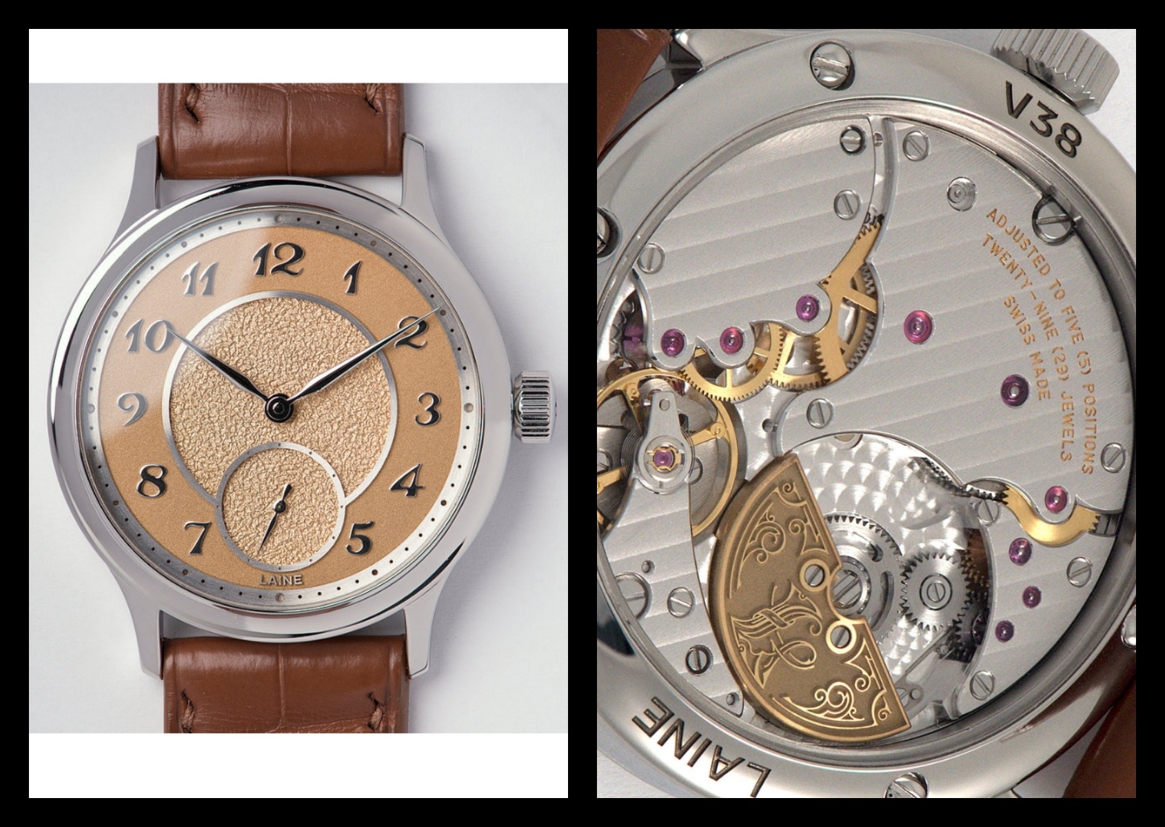 Giống như Bradley Taylor, Laine cũng liên hệ Vaucher cung cấp bộ máy Vaucher 5401/32 cho bộ sưu tập V38. Rotor siêu nhỏ trong bộ máy siêu mỏng khiến cho Laine V38 chỉ dày 9mm. Mặt số và bộ máy kết hợp hoàn hảo với nhau. Và cũng là chiếc đồng hồ có giá retail thấp nhất trong bài viết này, chỉ 9.400 CHF.