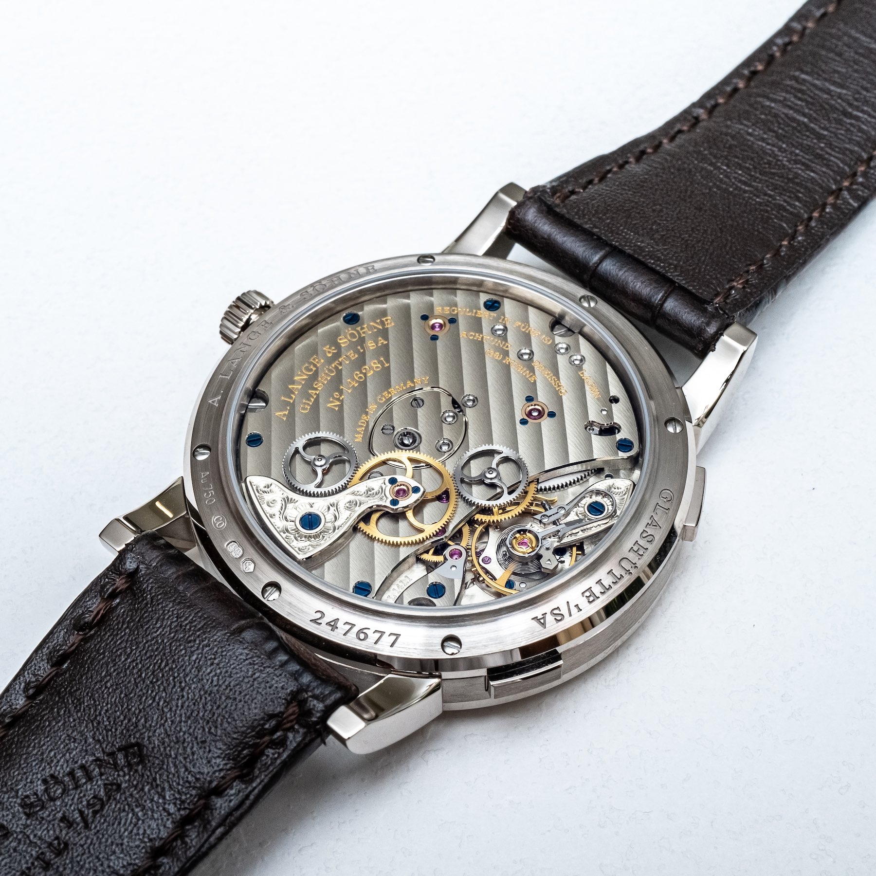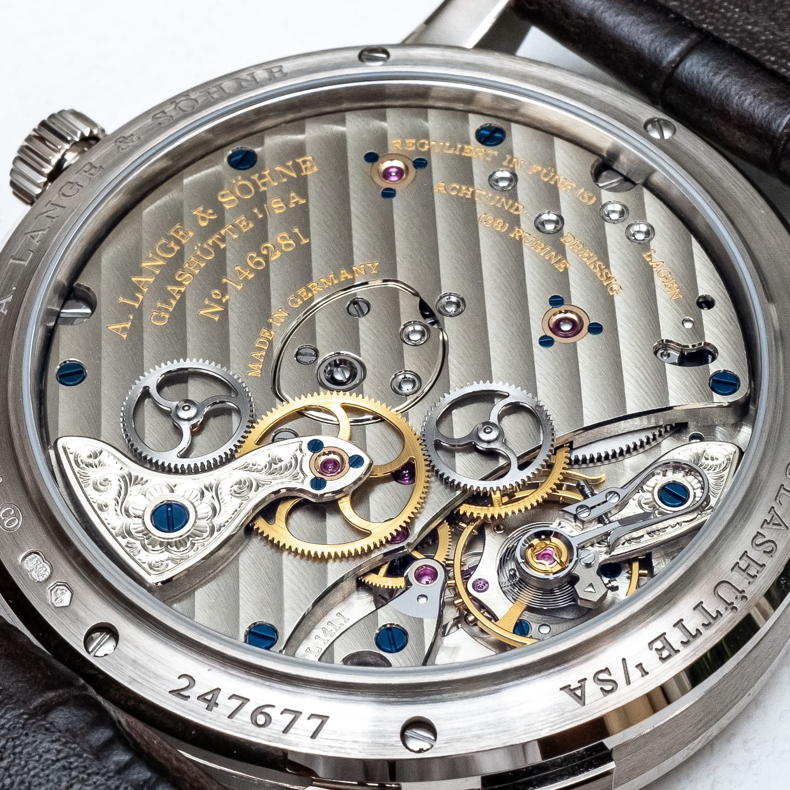 Chúng ta cũng có dây tóc và bánh xe cân bằng mới, nhưng không phải dây tóc Breguet và bánh xe cân bằng được điều chỉnh bằng quả nặng như bộ máy L155.1. Được lắp ráp từ 448 linh kiện, trong đó có 38 chân kính, bộ máy lên cót tay này quả thật là một kiệt tác của A. Lange & Sohne.