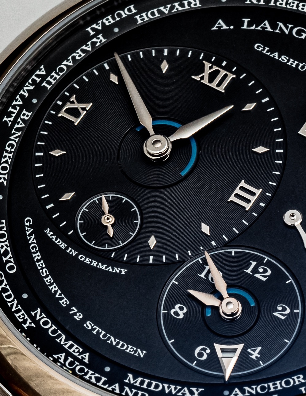 Phiên bản mới của dòng Lange 1 Time Zone đã nâng tầm thiết kế này lên một bậc, với việc đơn giản hóa những chi tiết vừa đủ cho người dùng có thể thấy rõ từng tính năng. Cơ chế hiển thị hai múi giờ được đặt trên hai mặt số, với mỗi mặt số thể hiện thời gian giờ/phút cụ thể. Để phân biệt sáng/tối, A. Lange & Sohne đã khéo léo đưa vào một vòng xoay với nửa màu xanh. Đây là một cách làm rất thông minh, giúp mặt số trông thanh thoát hơn so với phiên bản trước.