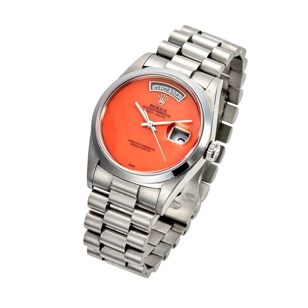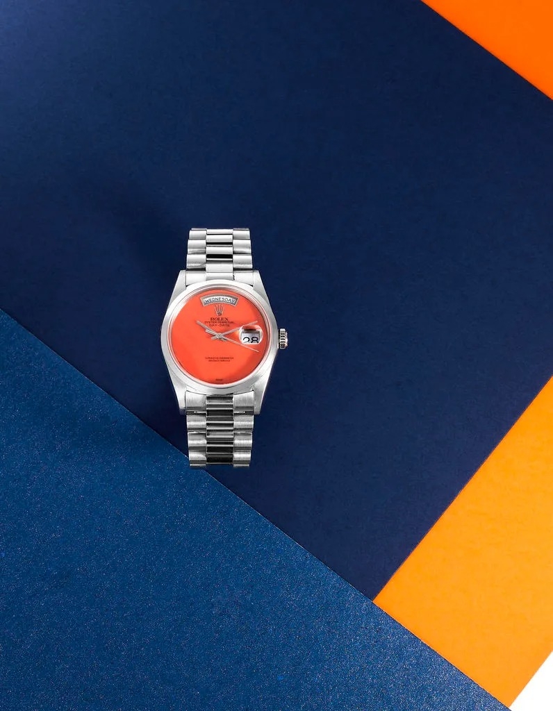 Sự kết hợp giữa bạch kim và mặt số màu san hô, chiếc Day-Date 18206 tại lô 210 là một món đồ quý hiếm. Rolex có sản xuất các mặt số bằng đá, nhưng với số lượng không nhiều. Chúng dễ bị vỡ trong quá trình sản xuất và lắp ráp hơn chất liệu thông thường. Day-Date 18206 được các chuyên gia đồng hồ tại Antiquorum đánh giá là một chiếc đồng hồ độc nhất vô nhị trên thị trường hiện nay.