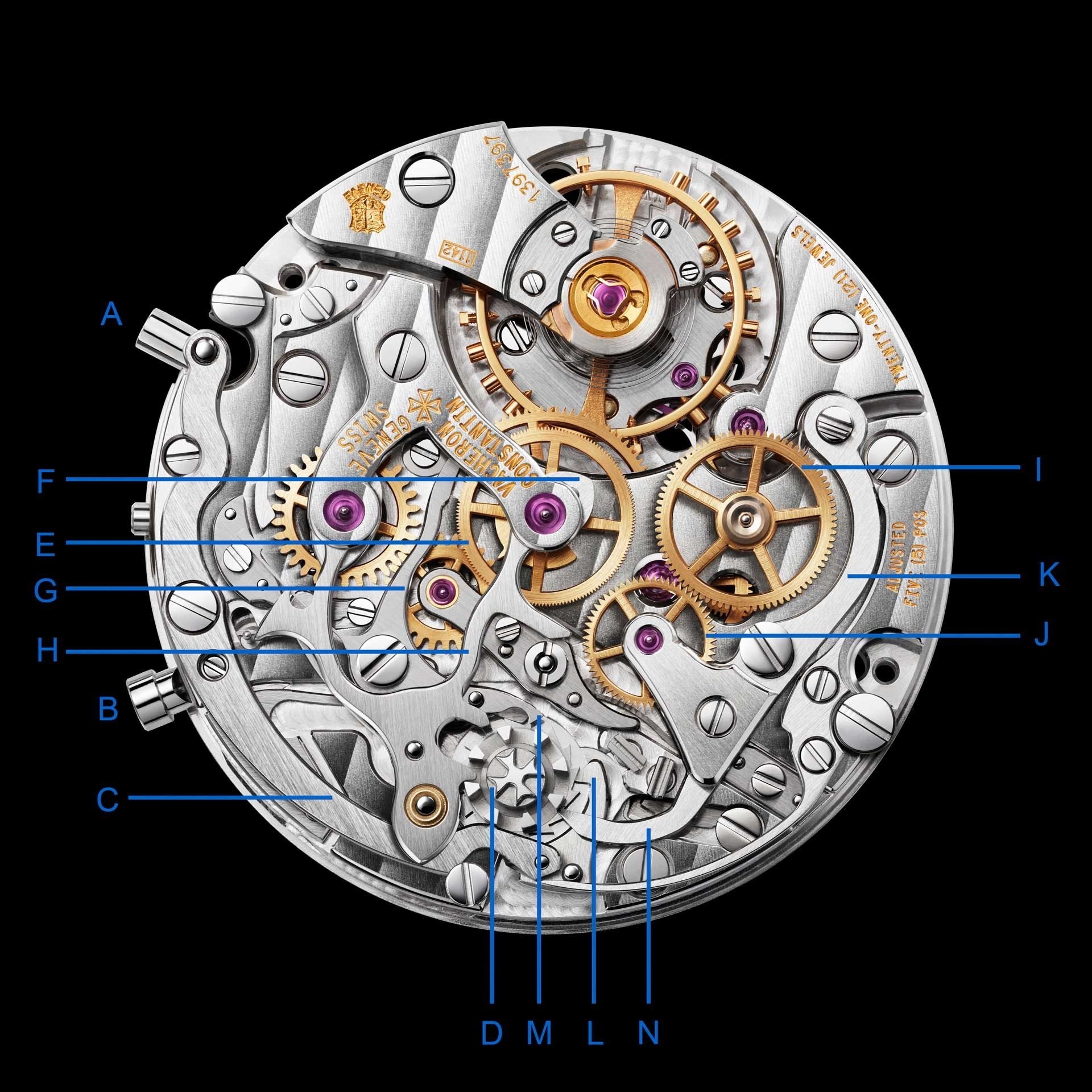 - F. Heart Piece Reset Cam: Bộ phận này cho phép bánh xe bấm giờ và kim giây được trở về mốc 0 ngay lập tức.