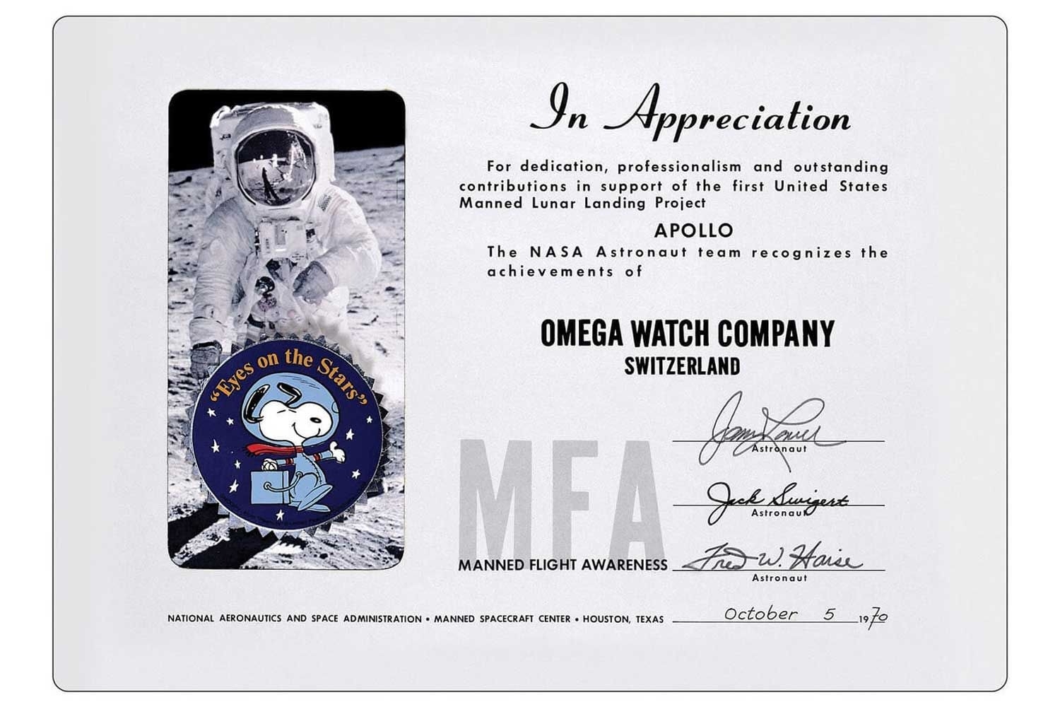 Giải thưởng được trao cho Omega bởi Jim Lovell, Jack Swigert và Fred Haise của phi hành đoàn Apollo 13.