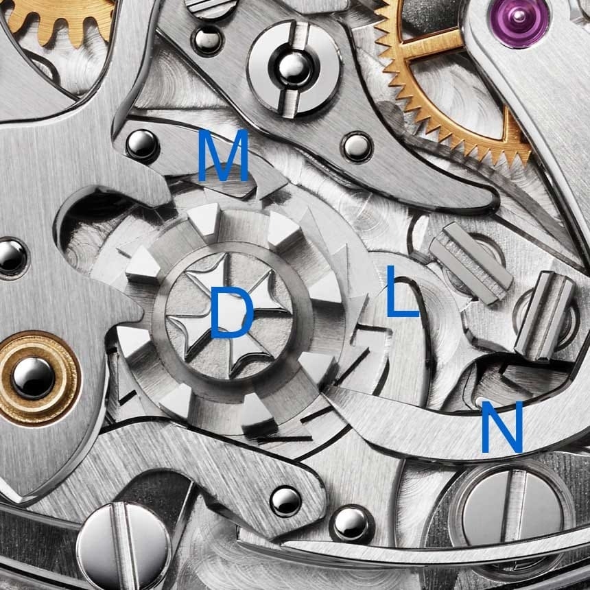Trong bộ máy có chứa bánh xe cột (column wheel) - một cơ chế trông giống như một tháp pháo (hoặc quân xe trong bộ cờ vua) sẽ quay với mỗi lần nút khởi động chức năng chronograph được kích hoạt. Cơ cấu bánh xe cột - do mang hình dạng ba chiều nên khó chế tạo hơn một đòn bẩy hai chiều đơn giản - có một bánh cóc với các răng cưa lớn được kết nối với nhau thông qua một cái búa và thanh đẩy riêng.