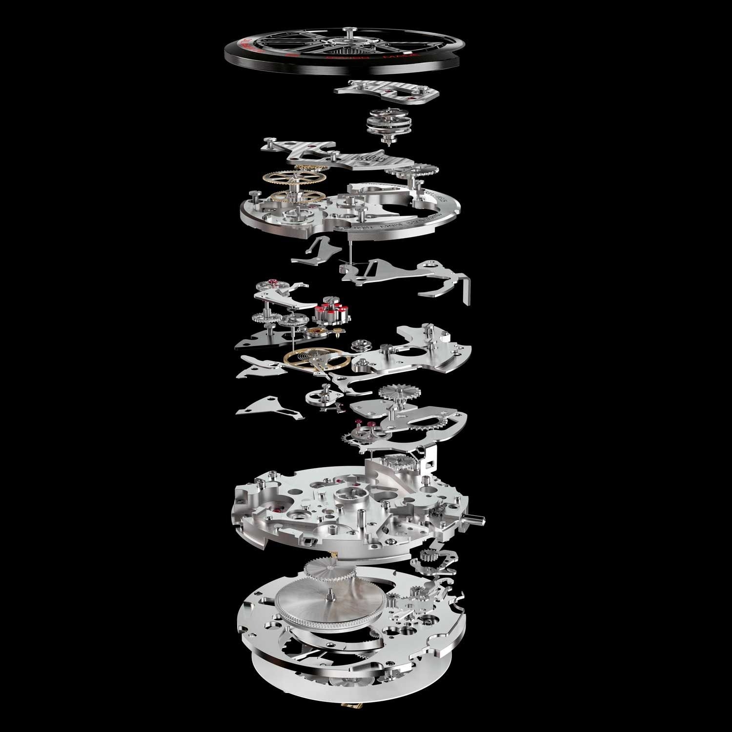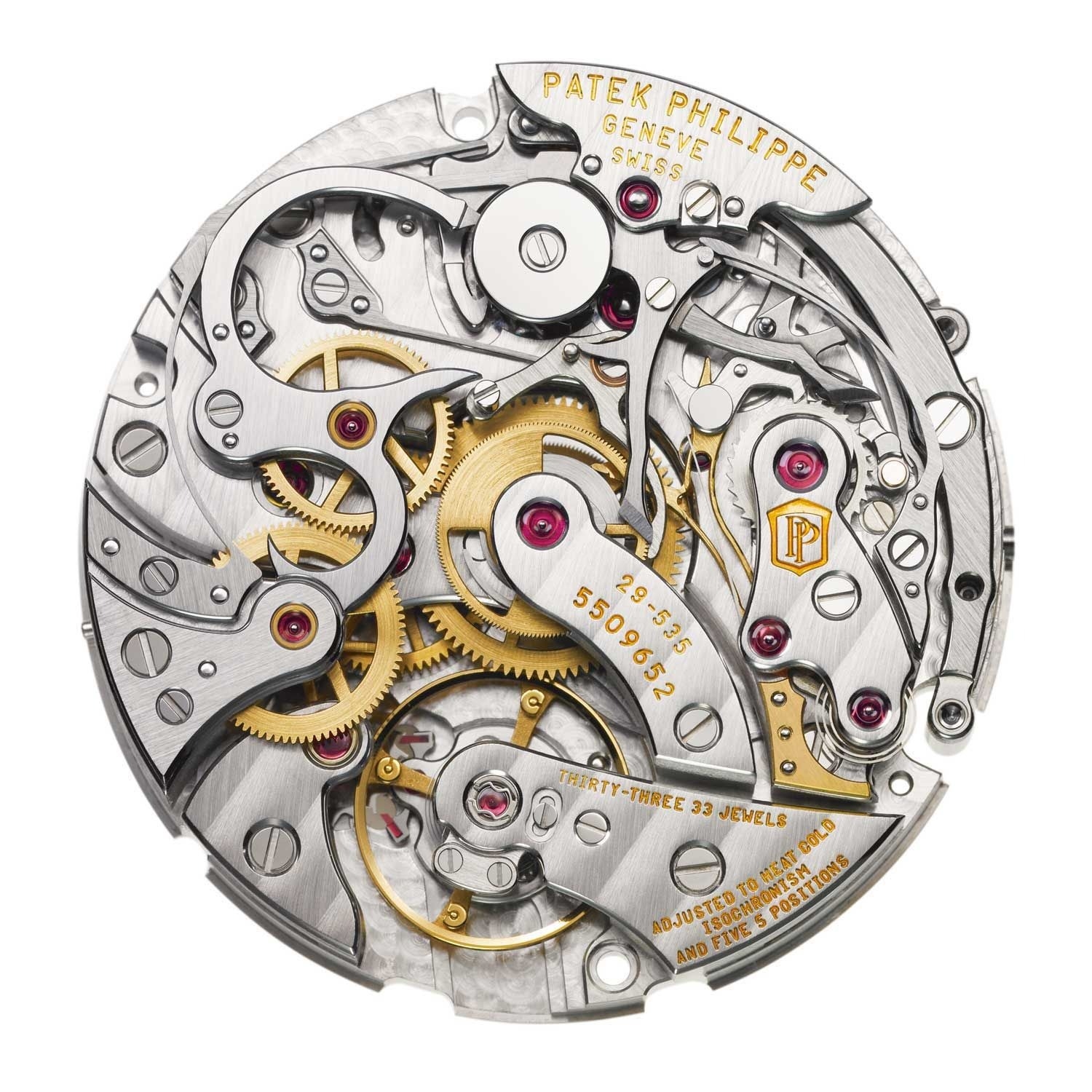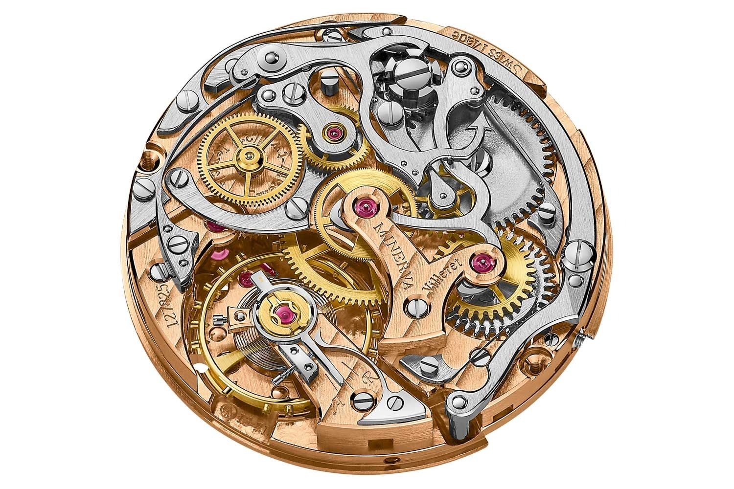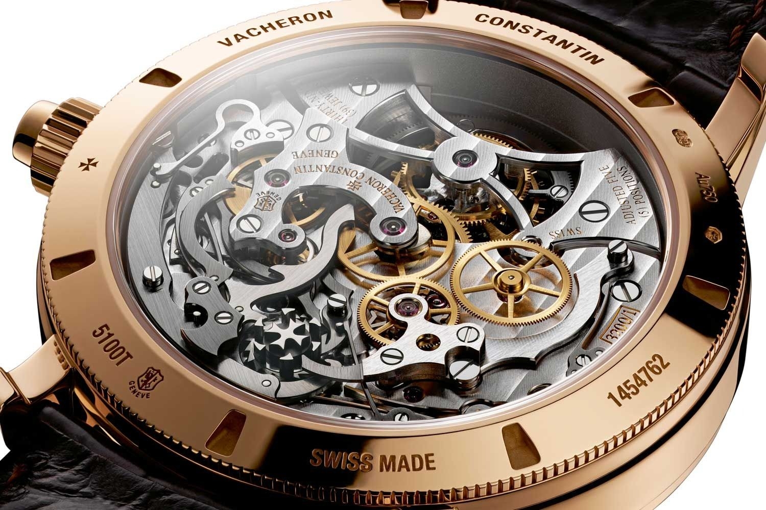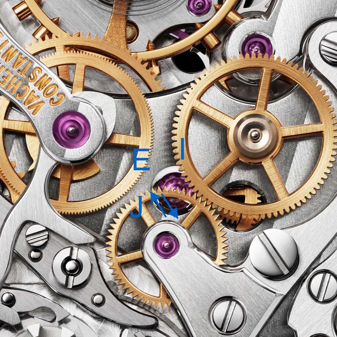 Bộ máy Vacheron Constantin 5100T và cấu trúc khớp nối ngang. Bánh xe dẫn động, bánh trung gian và bánh xe bấm giờ (hiển thị ở khoảng giữa ảnh) được làm nổi bật một cách tự nhiên nhờ lớp hoàn thiện bằng đồng thau được đánh bóng.
