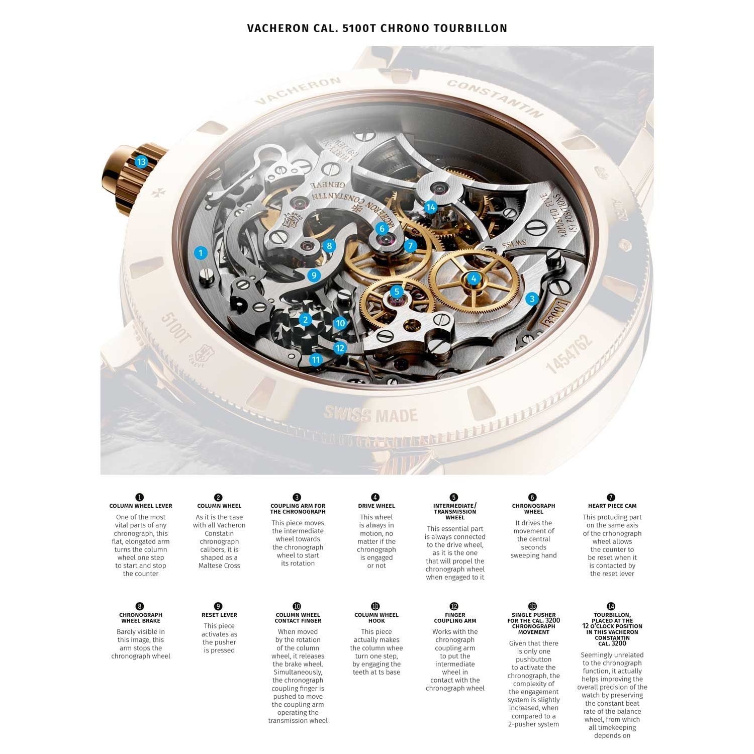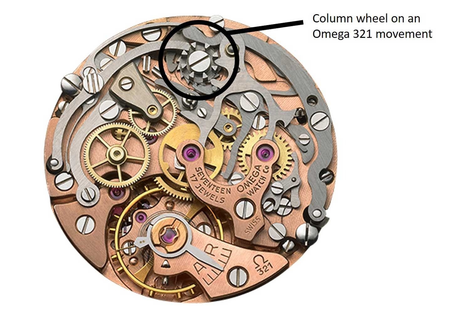 Để minh họa cách hoạt động của đồng hồ chronograph bánh xe cột, trước tiên chúng ta hãy điểm danh các bộ phận quan trọng của bộ máy. Những bộ phận này thường được tìm thấy ở phía trên của bộ máy nền khi nhìn đồng hồ từ phía sau.