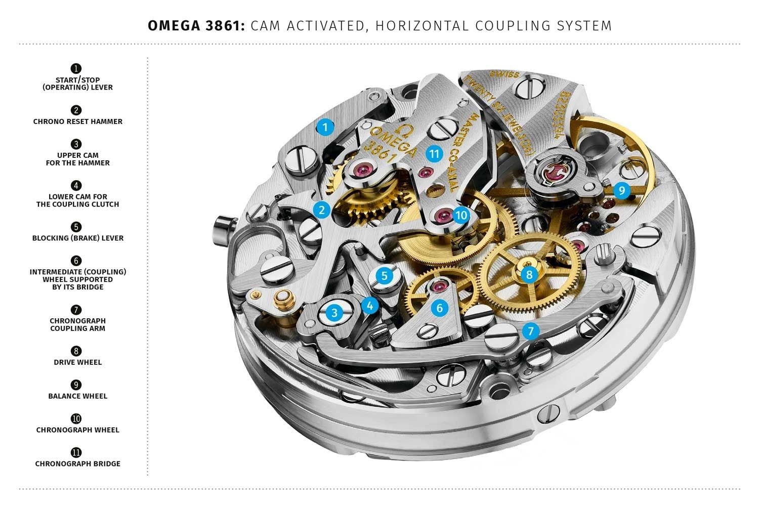 Bộ ly hợp khớp nối ngang gắn với các bánh răng, trong khi một bộ ly hợp dọc (của chức năng chronograph) được liên kết với bánh răng chính bằng một bánh lái trung chuyển (drive wheel). Khi cơ chế bấm giờ dừng lại, các liên kết bị tách khỏi cơ chế bấm giờ bằng cách sử dụng bộ ly hợp, và phanh hãm (brake) được kích hoạt. Khi cơ chế bấm giờ được đặt lại - việc này chỉ có thể được thực hiện sau khi cơ chế bấm giờ dừng lại (vì có một khóa ngăn không cho nó được kích hoạt), phanh sẽ bị vô hiệu hóa và búa đập vào cam tương ứng và đưa tất cả các kim về mốc 0.