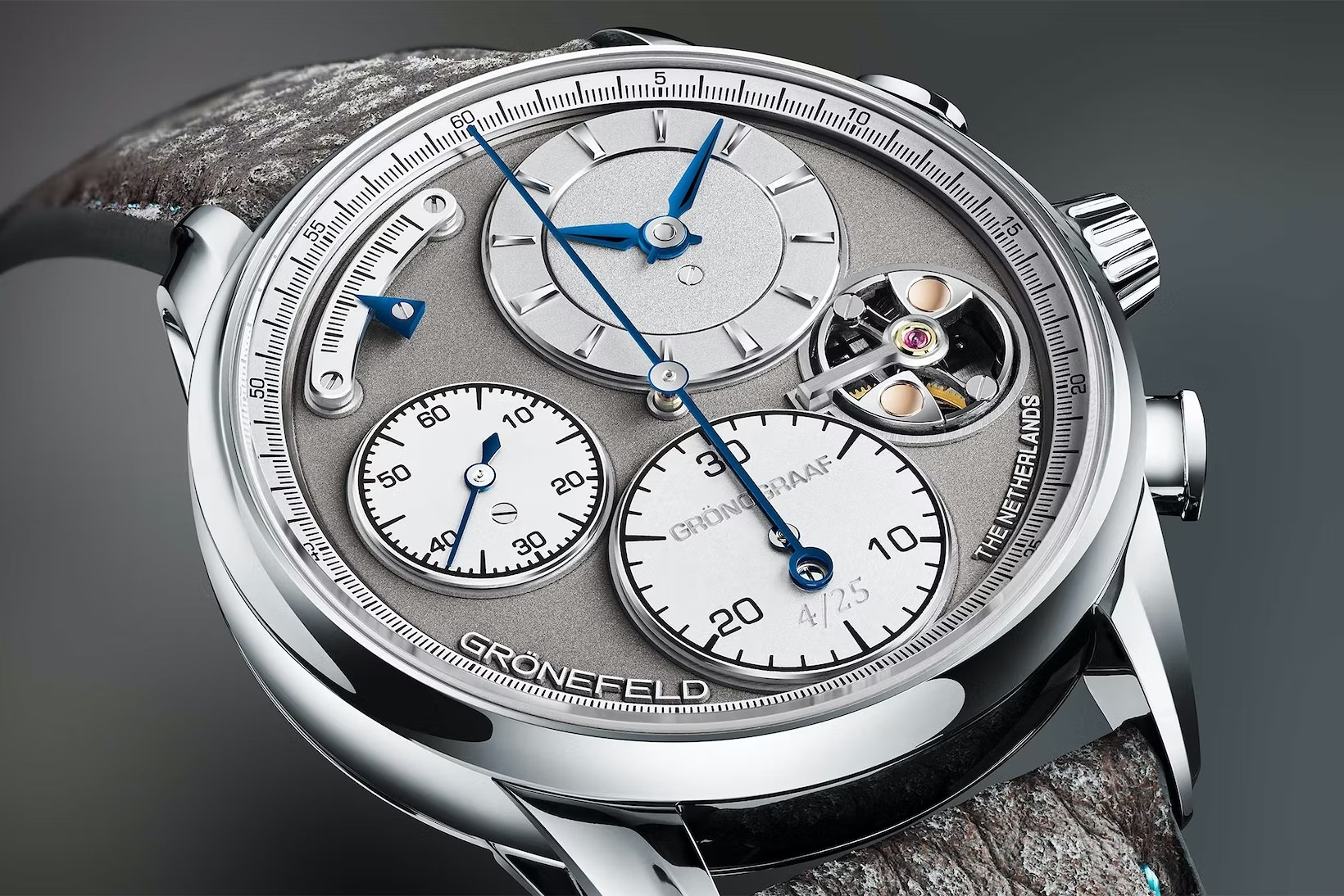 Gần đây nhất, thương hiệu Grönefeld đã cho ra mắt mẫu đồng hồ Chronograph đầu tiên của họ. Cỗ máy thời gian 1941 Grönograaf sở hữu một cơ chế rất hiếm, đó chính là kim phút Chronograph nhảy. Thay vì di chuyển từ từ trên mặt số, kim phút của chiếc 1941 Grönograaf sẽ nhảy khi kim giây di chuyển được một vòng. Nói thì có vẻ đơn giản, nhưng cơ chế này thật sự có độ phức tạp cao và đang được săn đón mạnh mẽ bởi giới mộ điệu.