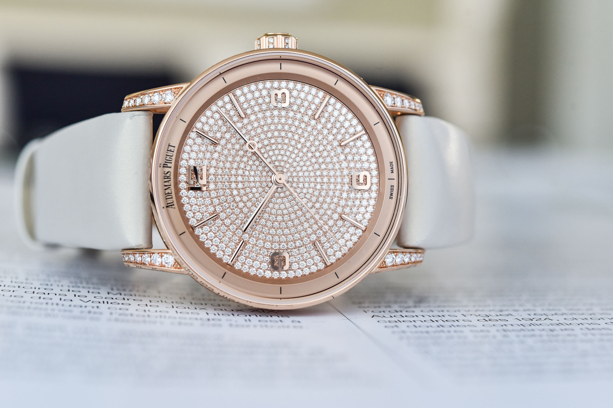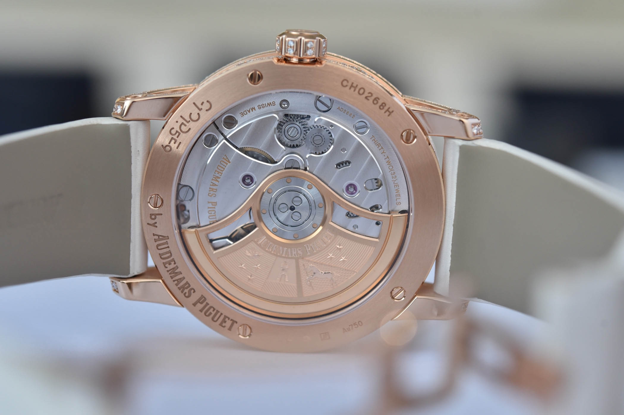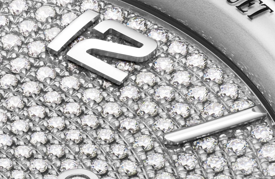 Để có thể len lỏi vào mọi ngóc ngách trên vỏ đồng hồ, Audemars Piguet đã lựa chọn những viên kim cương có kích thước khác nhau cho từng vị trí chuyên biệt. Phân biệt rõ nhất là kim cương nhỏ dần trên viền ngoài của phần càng nối, từ vành bezel kéo xuống dây.