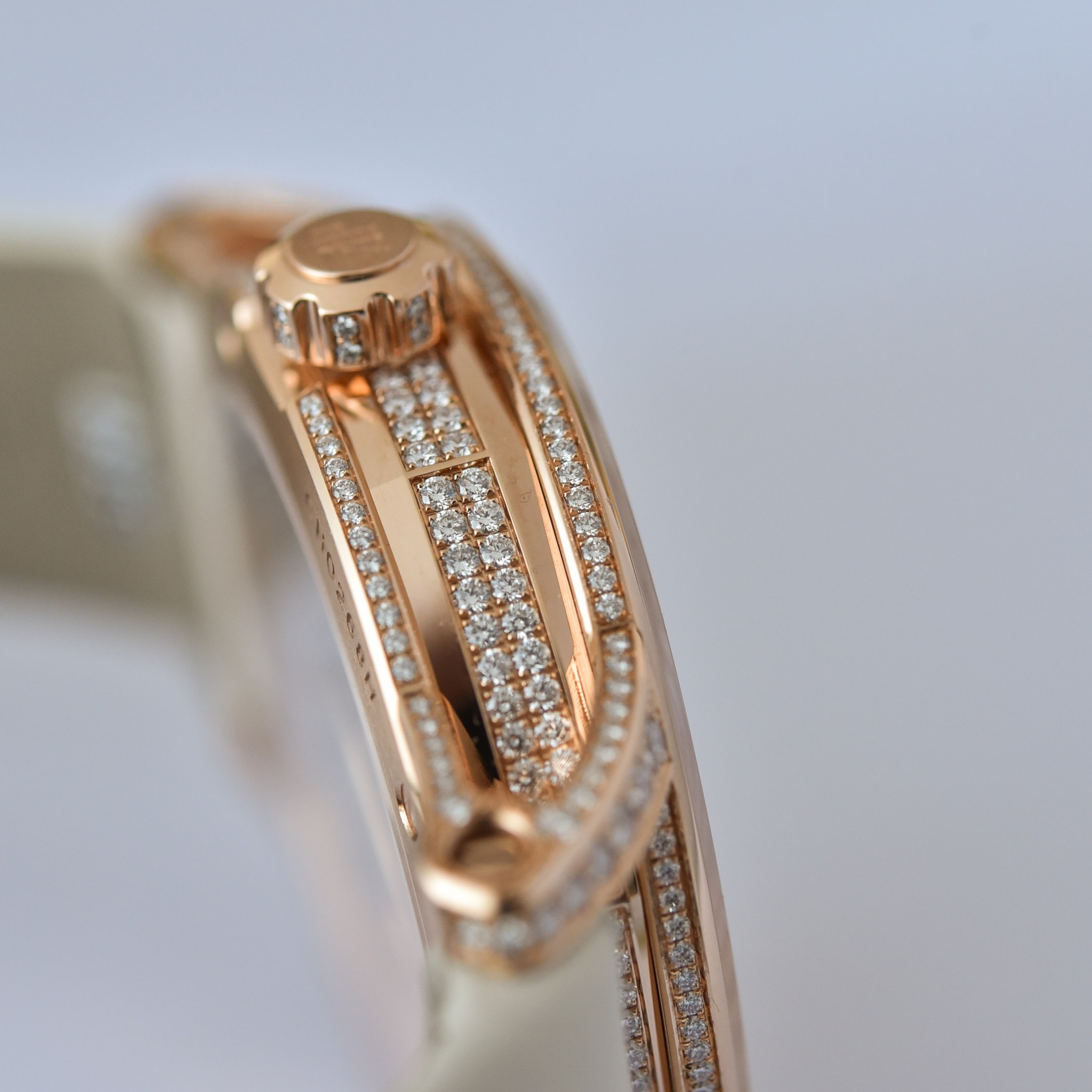 Khi nhìn từ cạnh bên, chúng ta có thể thấy càng nối dây được làm rỗng với liên kết hàn vào khung của vành bezel. Mọi bề mặt của vỏ đều được lát bằng kim cương, từ càng nối dây đến khung giữa hình bát giác hay cả các rãnh trên núm vặn đồng hồ.