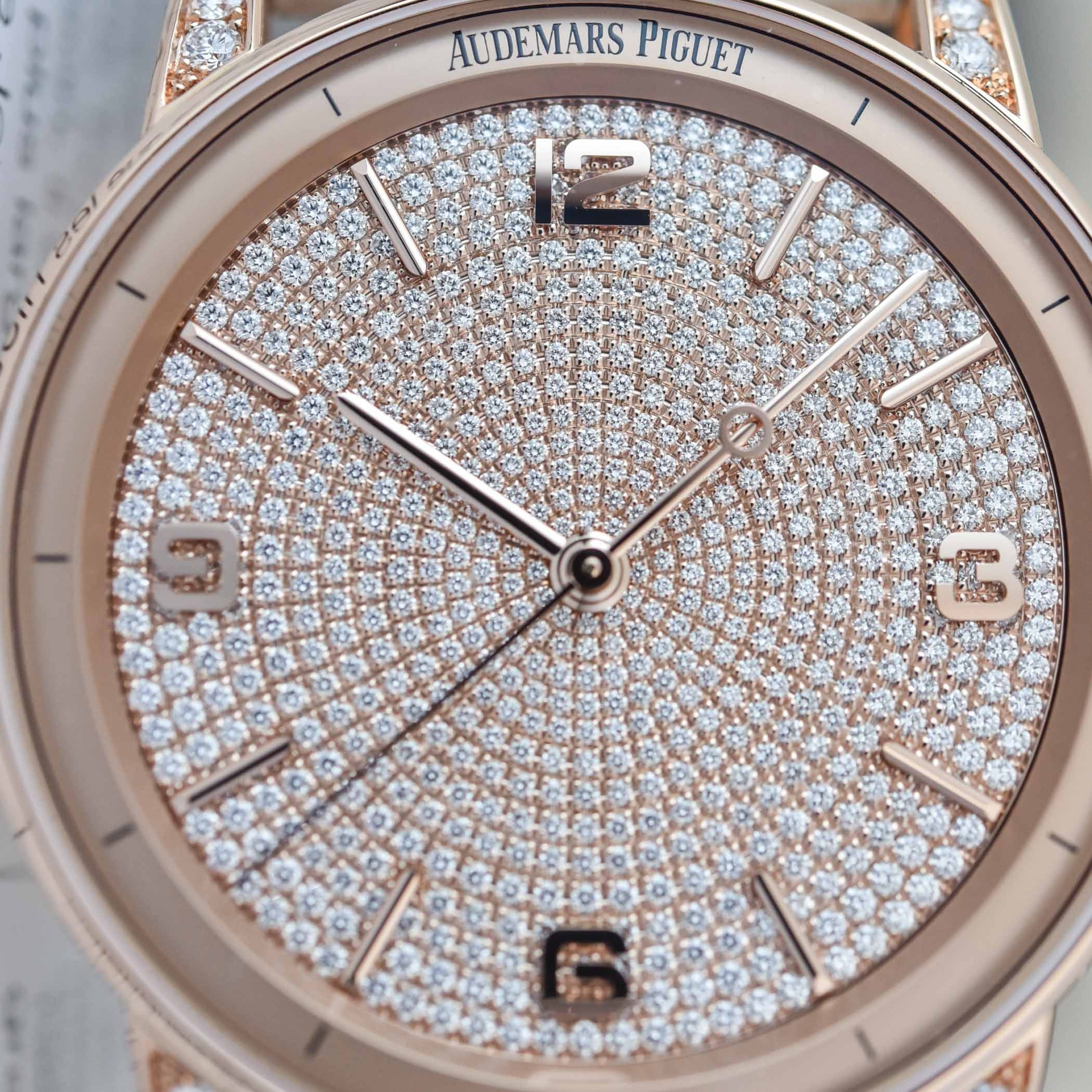 Sự có mặt của những viên kim cương khiến Audemars Piguet ý thức được rằng hãng cần xử lý mặt số trở nên tinh tế hơn để không làm mất đi sự lấp lánh hoàn hảo. Dù phiên bản được lựa chọn là bằng vàng trắng hay vàng hồng, nhà sản xuất cũng bố trí thêm một phần diện tích mở rộng bên ngoài để bố trí các vạch kẻ giờ, tên thương hiệu và dòng chữ Swiss Made. Trên phiên bản vàng trắng, phần diện tích này sẽ được làm từ rhodium còn phiên bản vàng hồng thì chất liệu vẫn là tương tự.