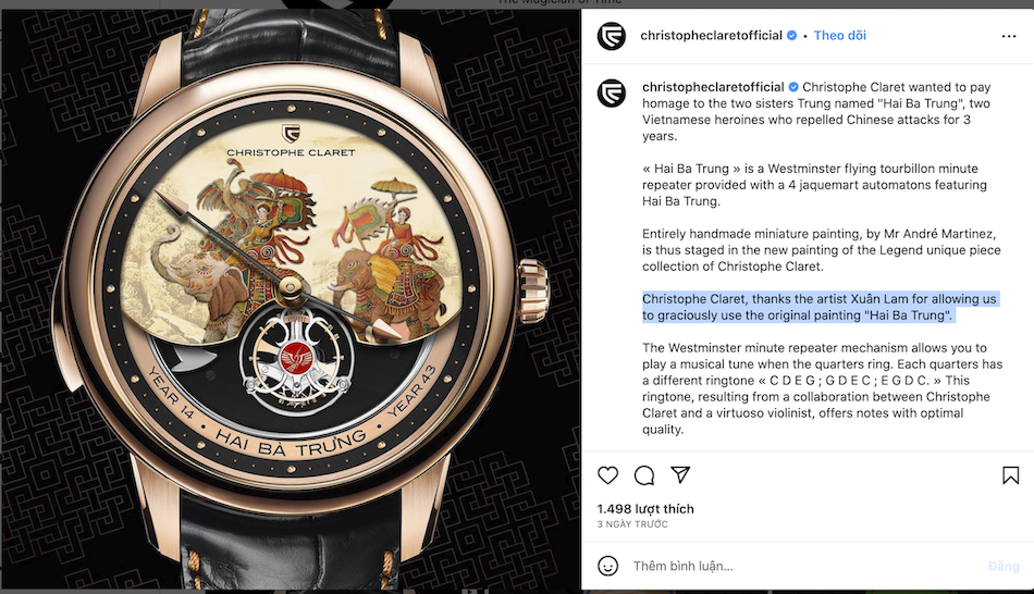 Tuy nhiên, ngay sau khi công bố về hình ảnh chiếc đồng hồ, nhiều người hâm mộ đã nhận ra bức tranh giống với một tác phẩm của hoạ sĩ người Việt: Xuân Lam. Đến ngày 4/7, thương hiệu Christophe Claret đã thêm vào dòng mô tả chiếc đồng hồ trên các trang mạng xã hội của mình dòng “thanks the artist Xuân Lam for allowing us to graciously use the original painting « Hai Ba Trung »”, để khẳng định về bức tranh gốc vốn là của một hoạ sĩ người Việt.