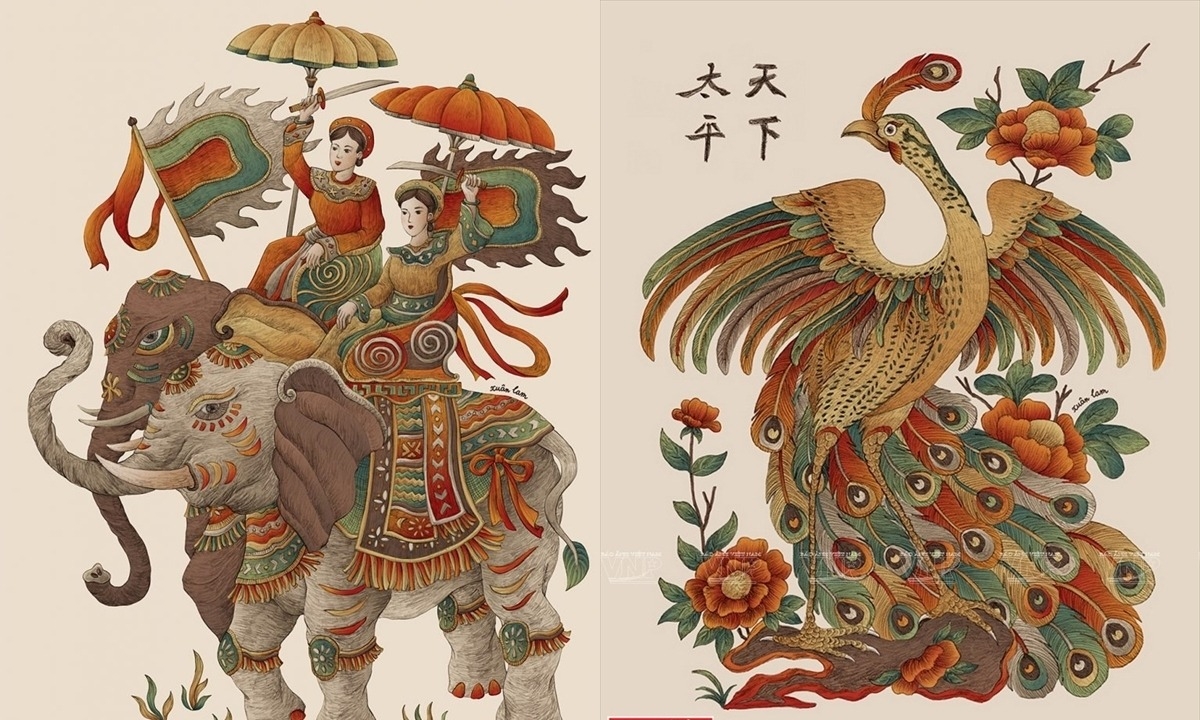 Tranh Hai Bà Trưng (trái) và tranh Thiên hạ thái bình của họa sĩ Xuân Lam