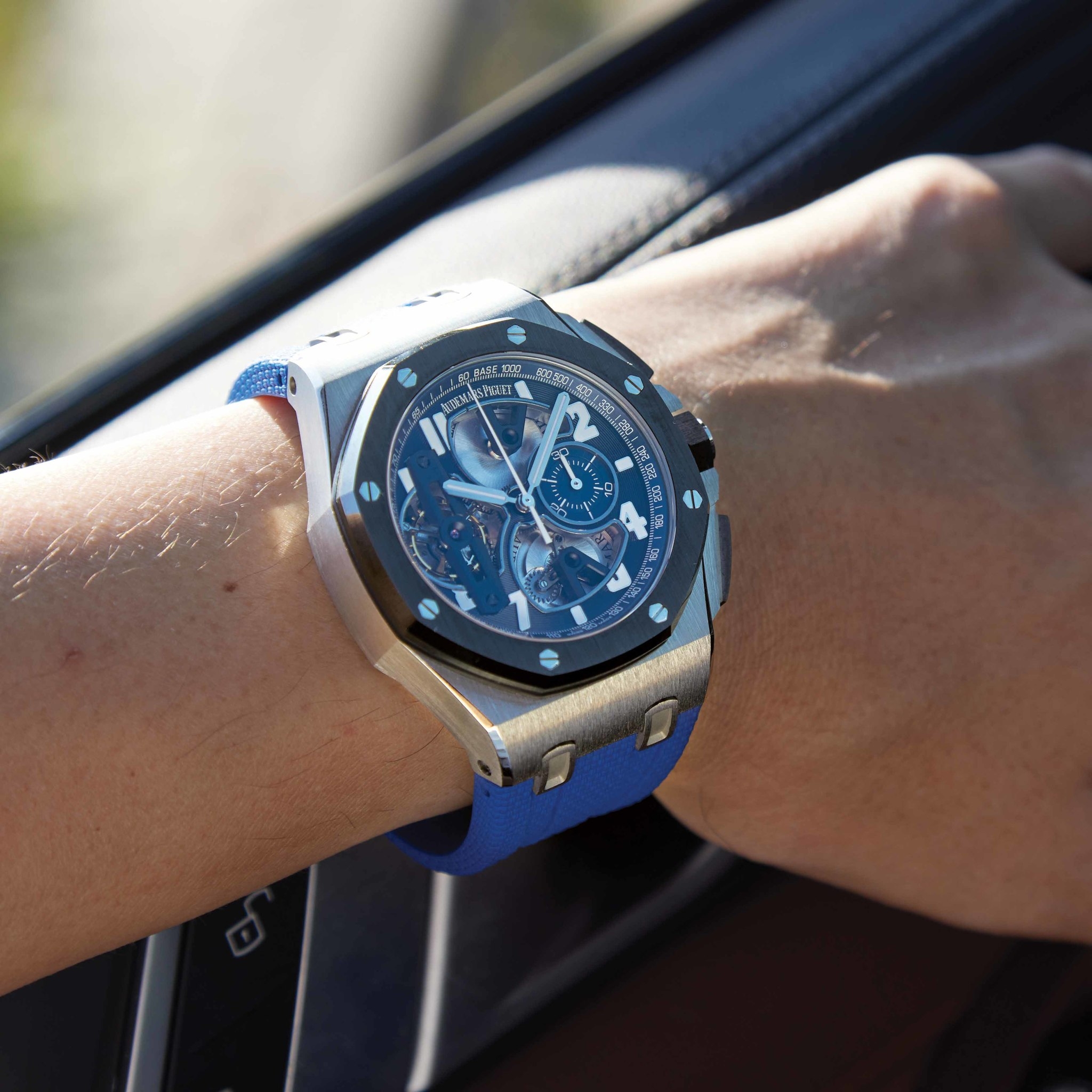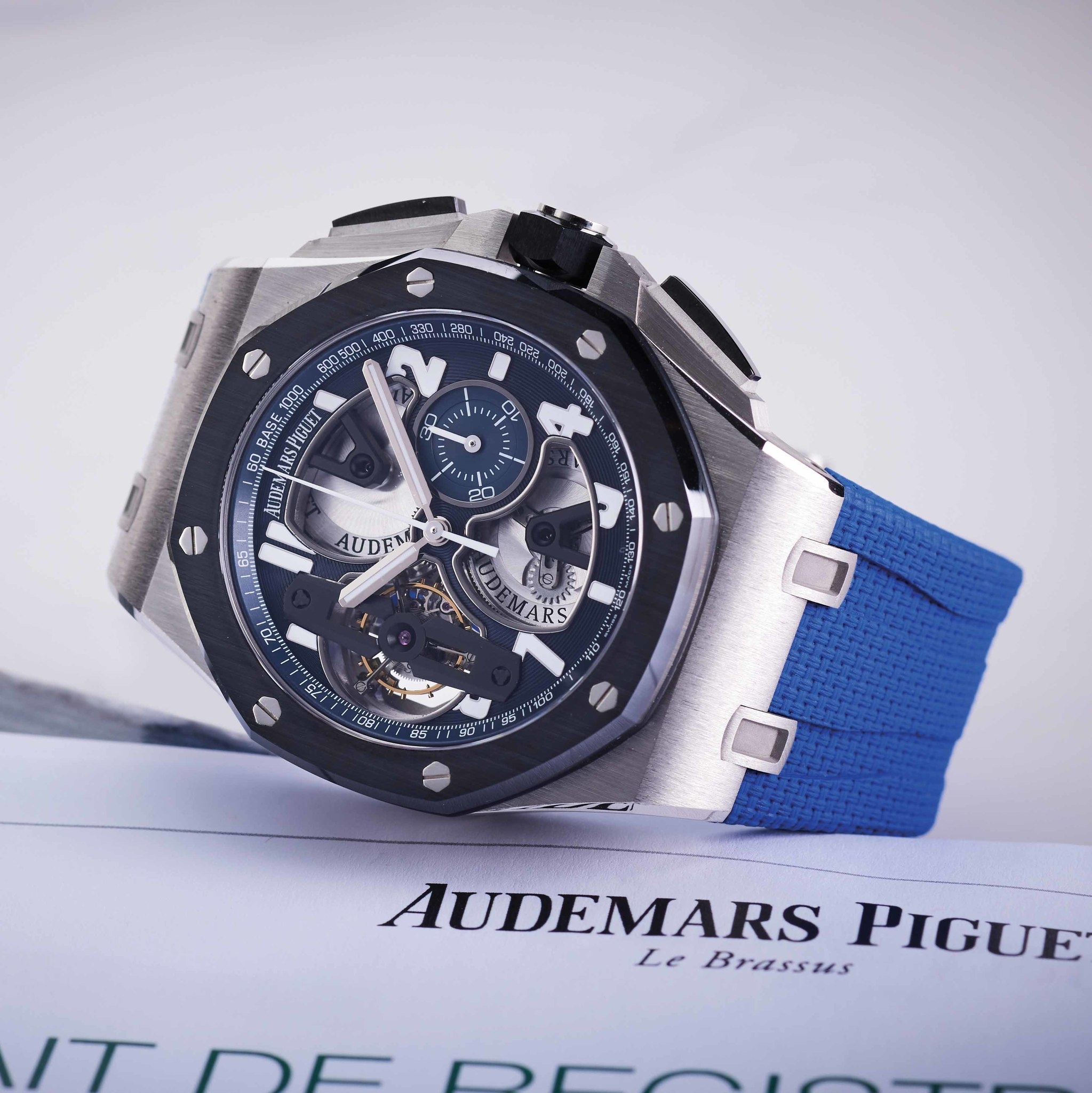 Ngành công nghiệp đồng hồ rất thích tung ra những mẫu bằng bạch kim đi kèm mặt số xanh lam. Dĩ nhiên đồng hồ có vỏ bạch kim không nhất thiết phải có mặt số xanh lam, nhưng sự kết hợp này đến nay vẫn tạo ra kết quả đẹp mắt. Với mẫu Royal Oak Offshore 26388 này đây cũng vậy. Audemars Piguet Royal Oak Offshore Tourbillon Chronograph 26388PO.OO.D027CA.01 sở hữu bộ vỏ bạch kim, mặt số màu xanh đậm và bộ dây đeo cao su màu xanh. Thật khó tin, bởi vào thời điểm mẫu đồng hồ này được sản xuất vào năm 2014, việc kết hợp dây đeo cao su và một mẫu đồng hồ có tourbillon quả thật không phải điều phổ biến. Còn nếu là 20 năm trước đó, Royal Oak Offshore cũng là một trong những thiết kế tiên phong có dây đeo cao su.