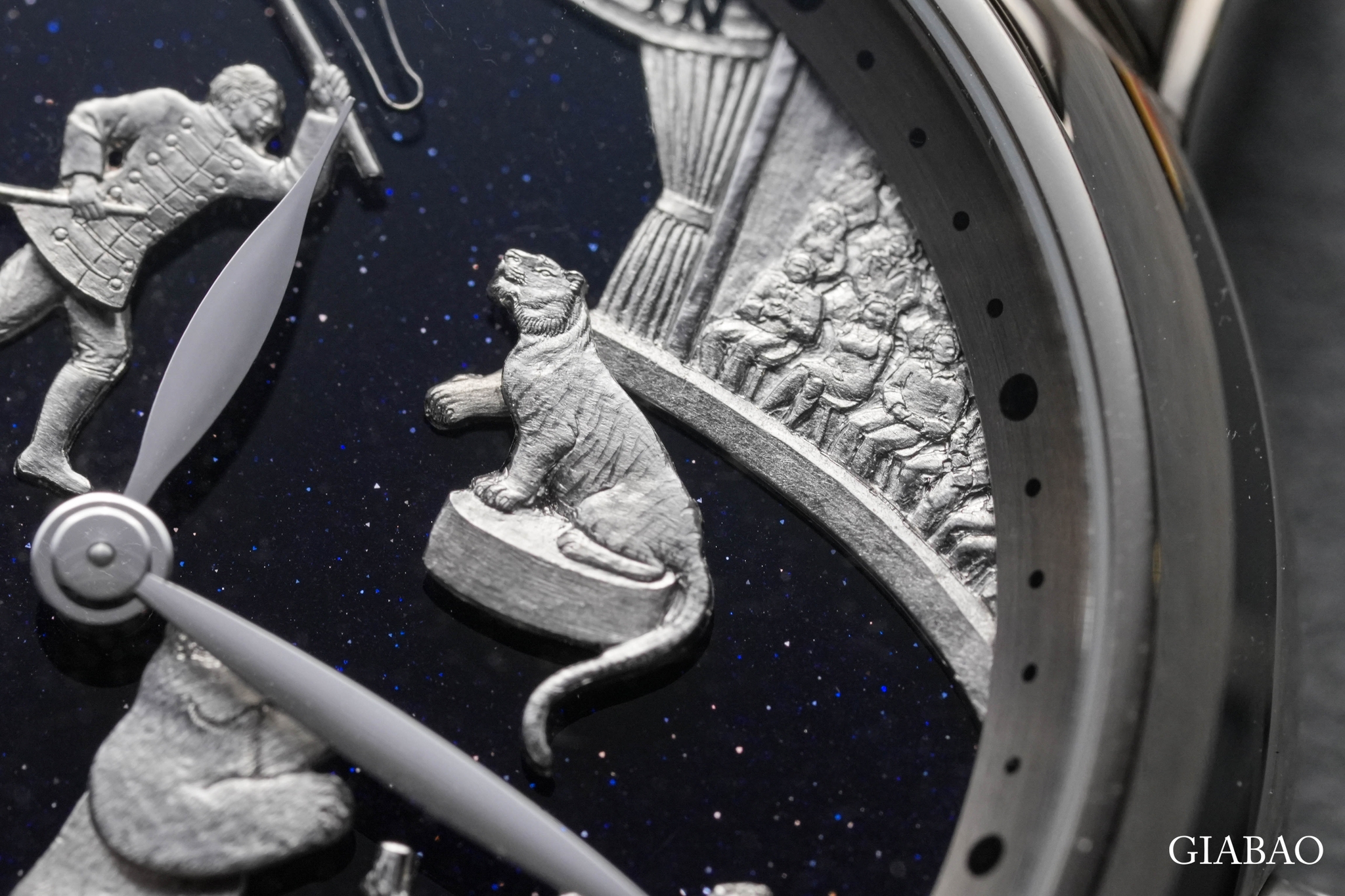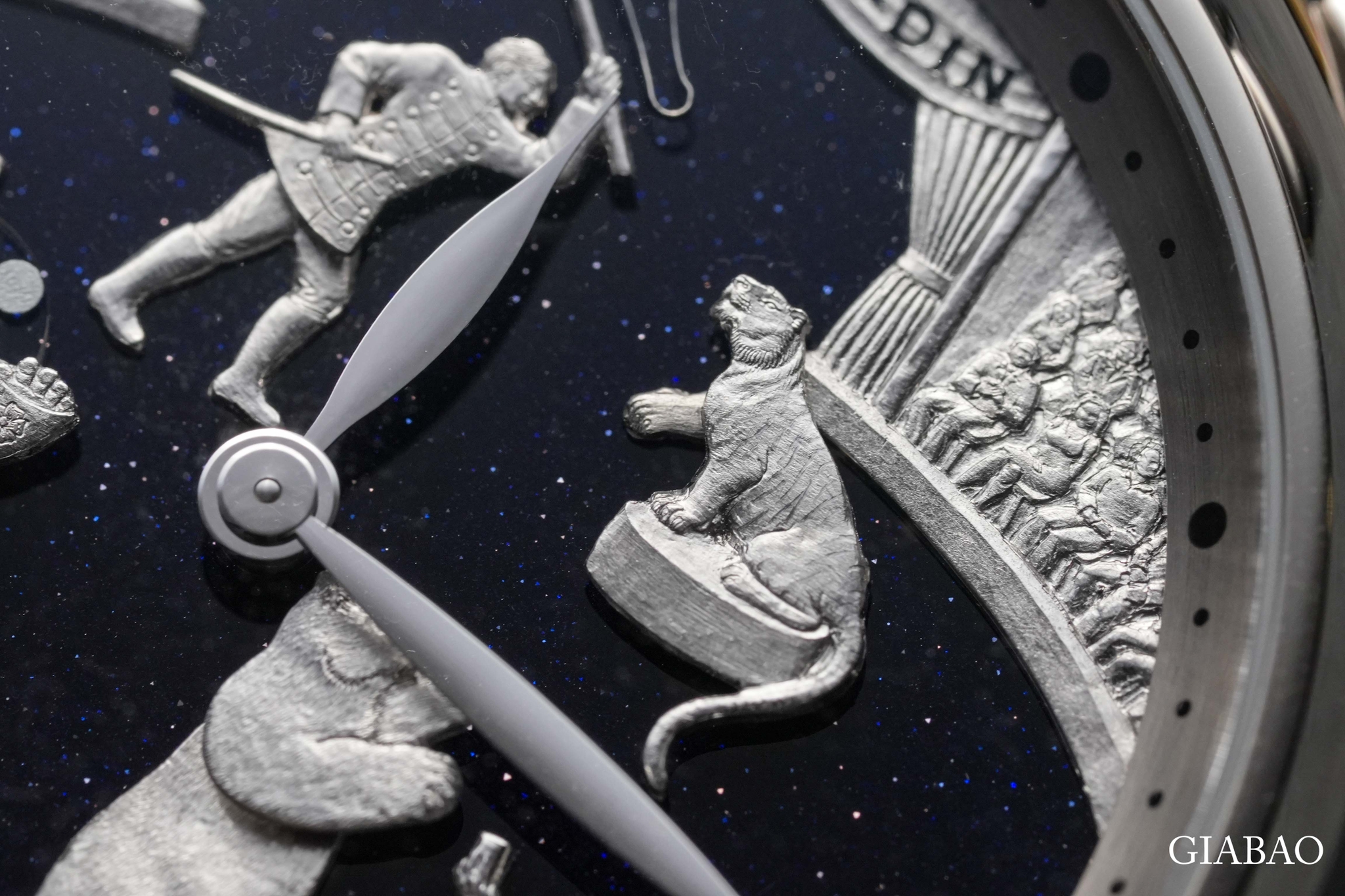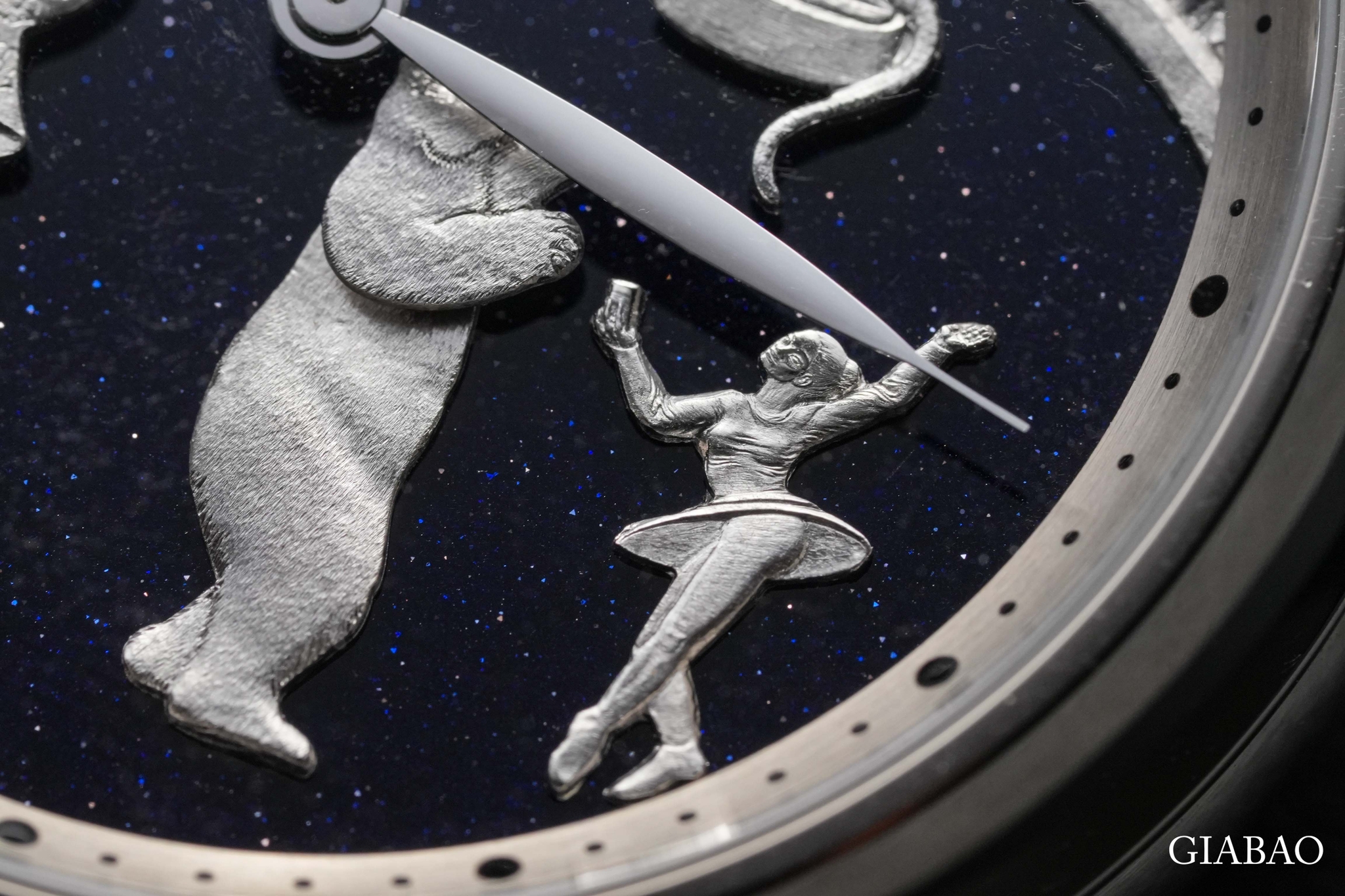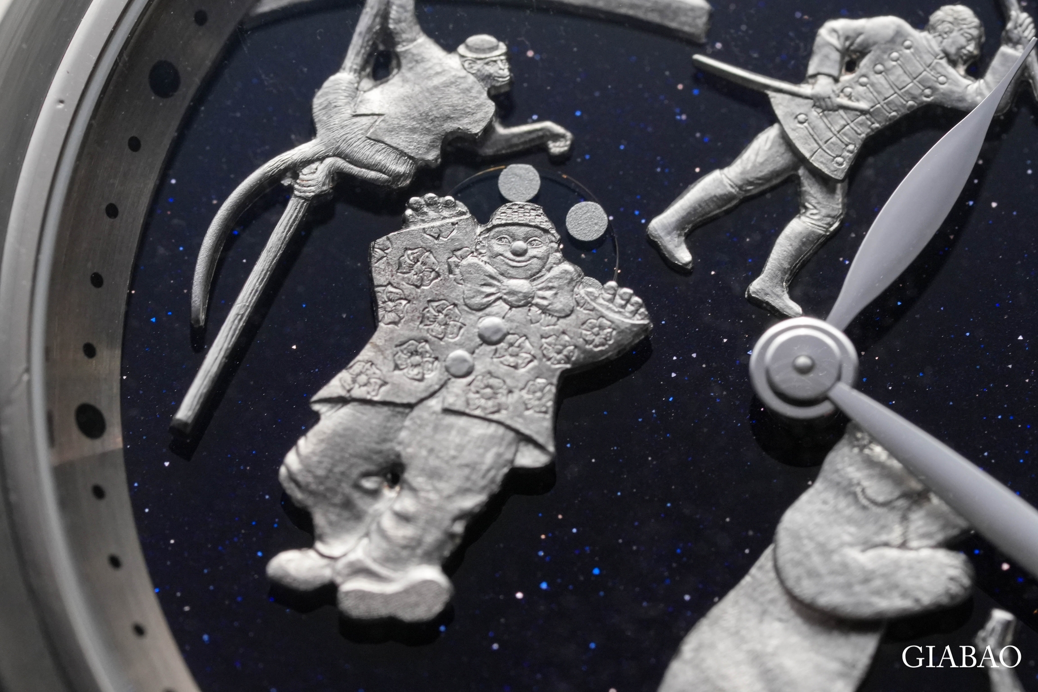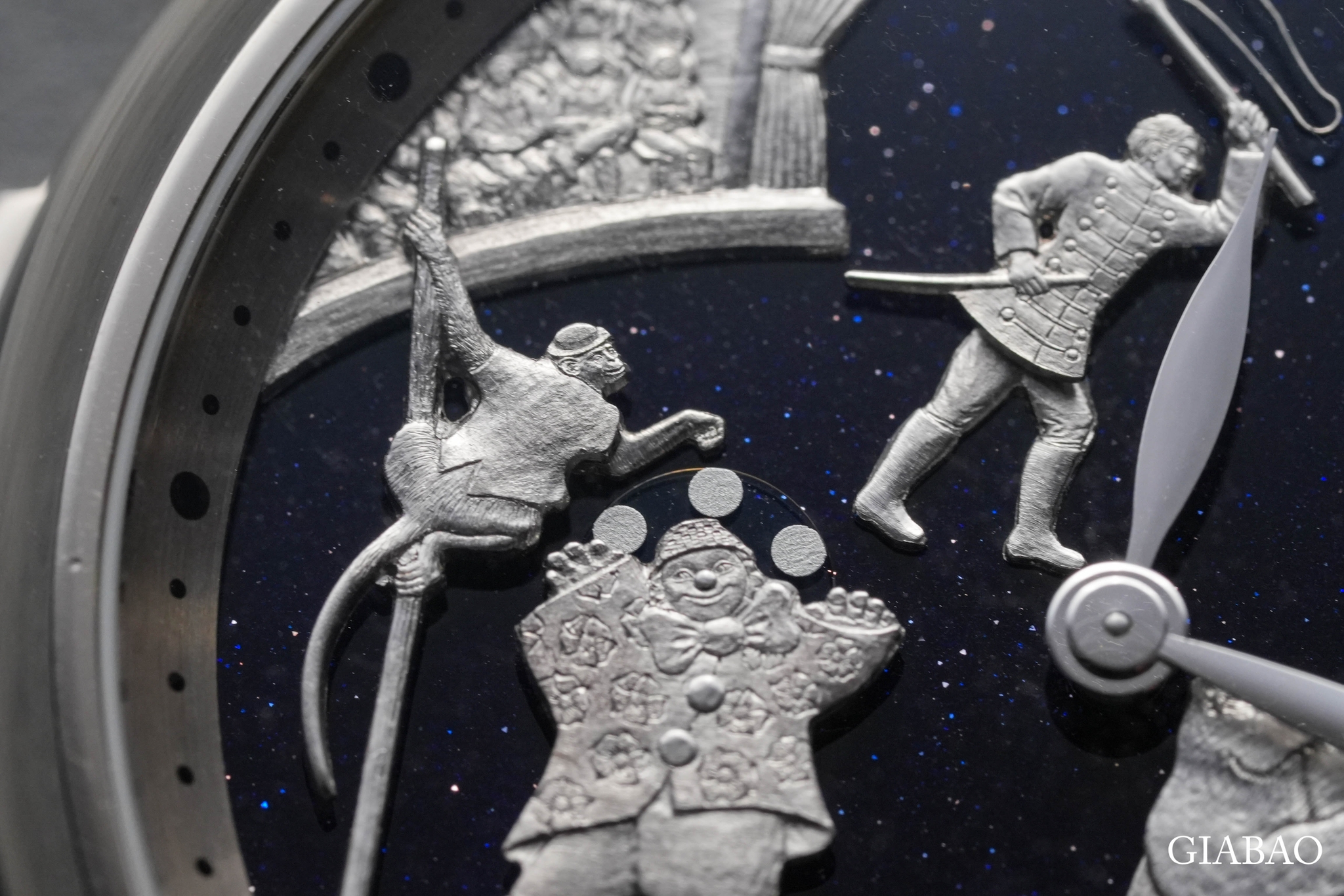 Không dừng ở đó, buổi trình diễn của những nhân vật tài năng là một màn trình diễn hoàn hảo, có sự hỗ trợ của âm thanh, được kích hoạt bằng cần gạt ở bên phải của đồng hồ. Đó màn trình diễn hoà quyện tuyệt vời giữa âm thanh và hình ảnh, một điều thực sự hiếm gặp trong ngành chế tạo đồng hồ.