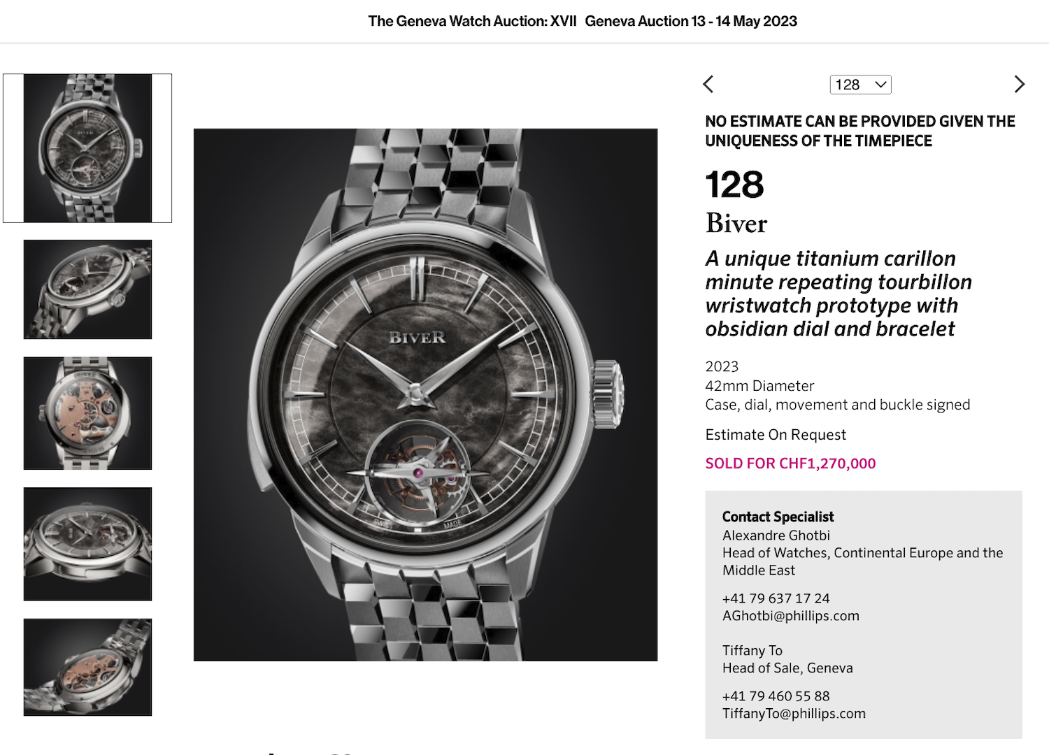 Cũng trong buổi giới thiệu, Jean-Claude Biver có nhắc đến việc mình sẽ gửi một chiếc nguyên mẫu của Carillon Tourbillon Biver đến nhà đấu giá Phillips để chiếc đồng hồ đến tay một nhà sưu tập thực thụ, người đánh giá cao chiếc đồng hồ. Vừa hay, cuộc đấu giá nhà Phillips đã có kết quả. Chiếc đồng hồ Carillon Tourbillon Biver nguyên mẫu, độc nhất đã được bán thành công với giá 1.270.000 CHF, gấp đôi giá công bố ban đầu từ hãng.