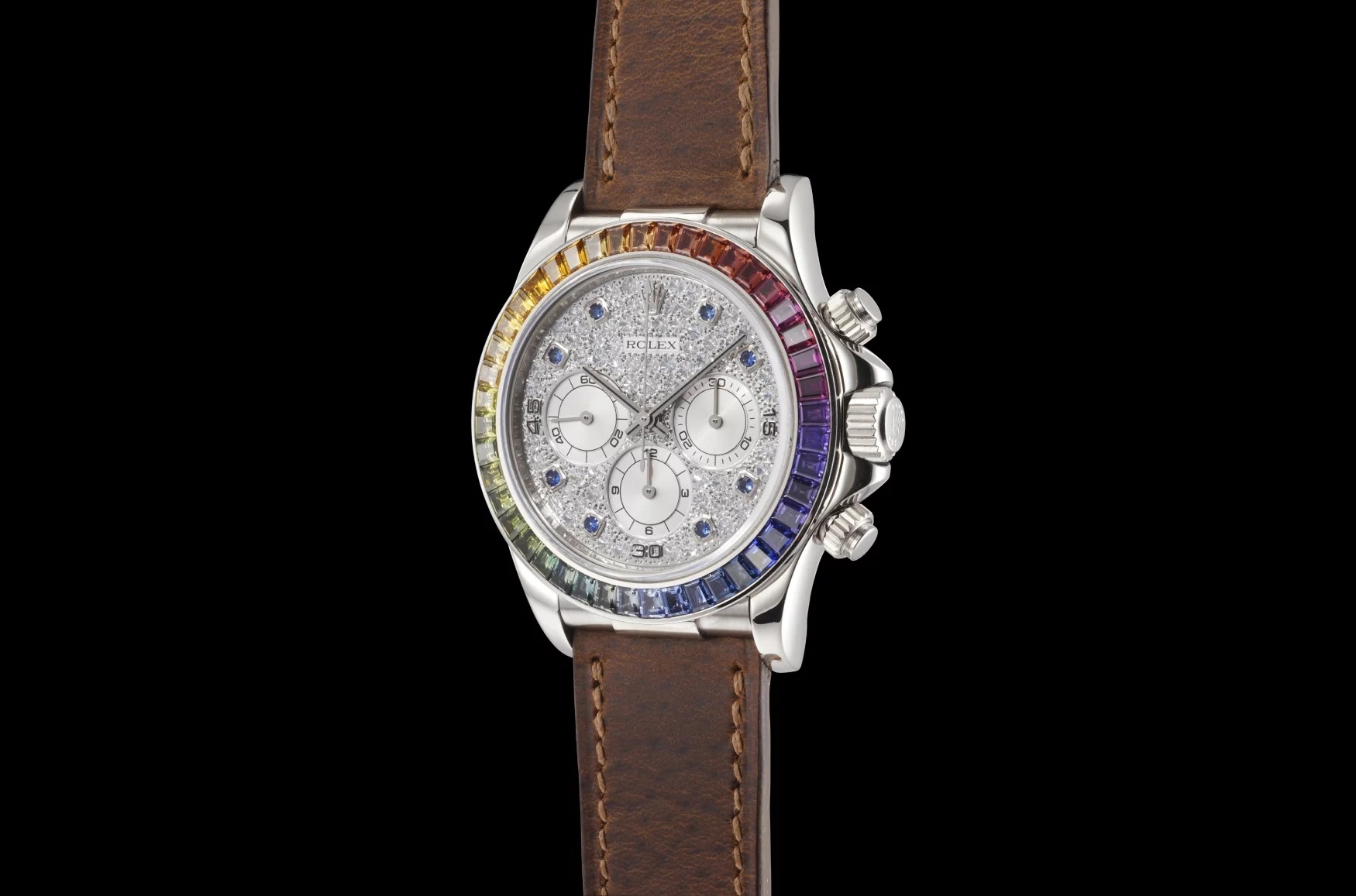 Về nguồn gốc, chiếc đồng hồ này được thương hiệu Rolex sản xuất như một đơn đặt hàng đặc biệt chỉ có một lần cho một khách hàng của hãng. Và chắc chắn rồi, đó ắt hẳn là một khách hàng lớn của thương hiệu này vào những năm 90. Mặc dù trước đó đã có những chiếc Daytona chạy bằng máy El Primero được gắn thêm kim cương, nhưng chúng chỉ có một hoặc có thể là hai màu đá. Việc phát triển từ một thiết kế khá kỳ lạ: một dãy đá quý đủ màu sắc trên một chiếc đồng hồ cơ lúc này là một lựa chọn táo bạo.