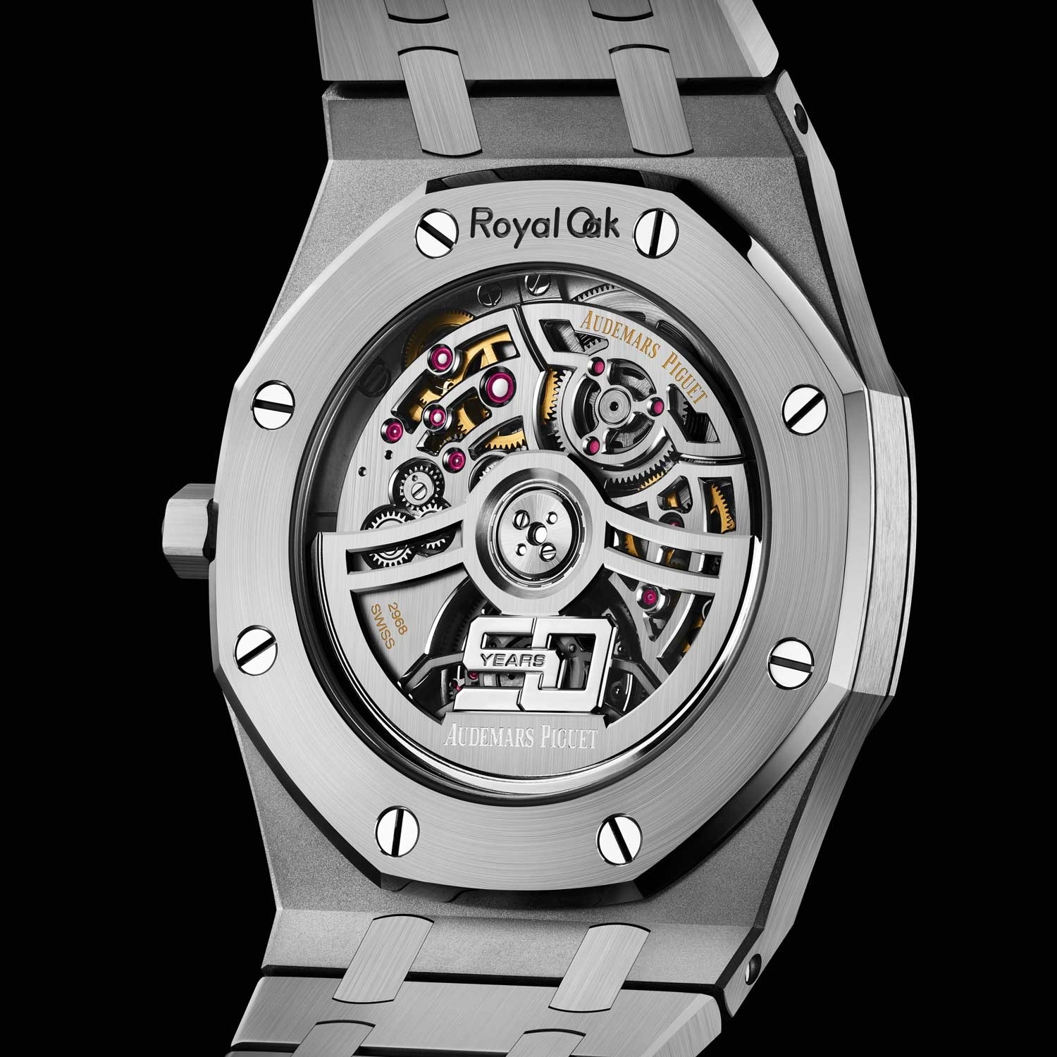 Phía sau đồng hồ, đáy sapphire để lại cơ hội tuyệt vời cho người chơi ngắm nhìn bộ máy đã được thiết kế skeleton một phần. Cầu nối đã không còn được được trang trí theo kiểu Côtes de Genève truyền thống mà là những đường thẳng hiện đại hơn. Ngược lại, đường vát được đánh bóng tinh tế của các cạnh bên ngoài và thậm chí đối với các góc bên trong của các bộ phận tiết lộ chuyên môn của AP trong các kỹ thuật hoàn thiện thủ công cổ điển. Rotor đồng hồ cũng được thiết kế dạng skeleton với con số 50 năm - tuyên bố dành riêng cho đồng hồ Royal Oak được sản xuất vào năm 2022.