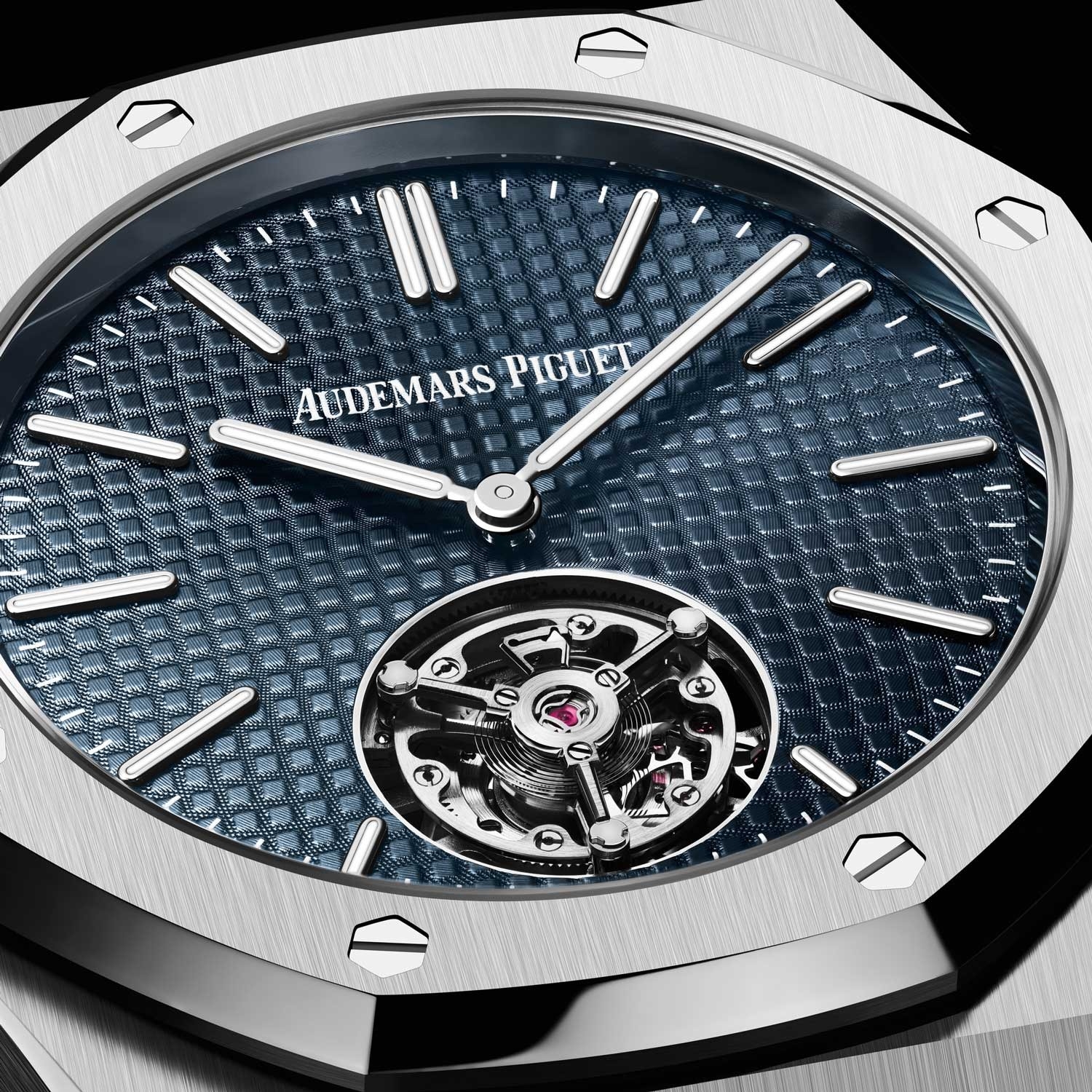 Nếu bộ máy của RD#3 có những cập nhật mới thì mặt số của mẫu đồng hồ này lại đậm chấn Royal Oak nguyên bản. Lồng flying tourbillon nằm ở góc góc 6 giờ, thay cho logo “AP” như trên chiếc Royal Oak 16202. Nền mặt số được trang trí bằng họa tiết guilloche Petite Tapisserie có màu Bleu Nuit, Nuage 50, màu xanh đêm khói như trên chiếc Royal Oak nguyên bản 5402.
