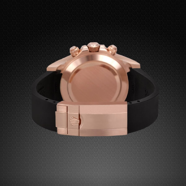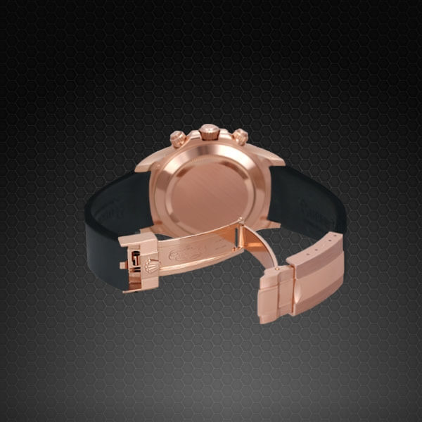 Thiết kế dây cao su Rubber B Rolex Daytona bản vàng hồng Classic Series với điểm nhấn là cao su có nhiều sự lựa chọn màu, thiết kế thuôn gọn và khỏe khoắn, điểm đặc bệt của dây này là chỉ thay phân dây kim loại và sử dụng khóa Glidelock nguyên bản của Rolex.