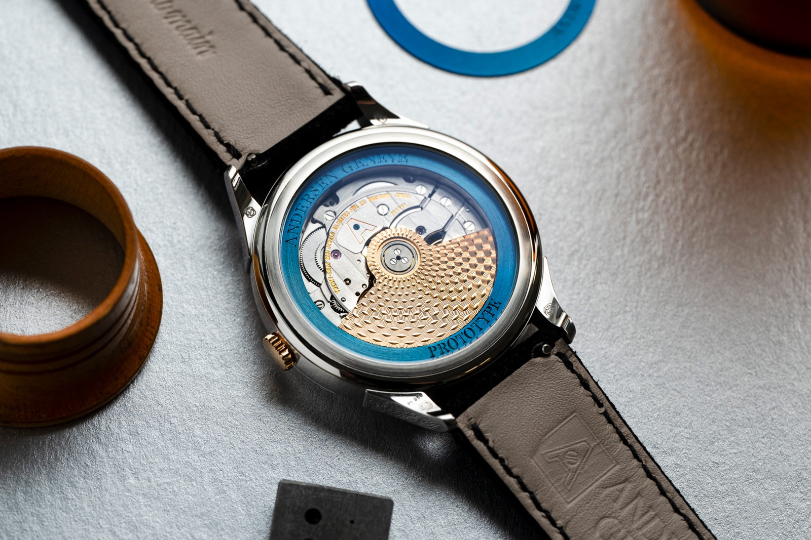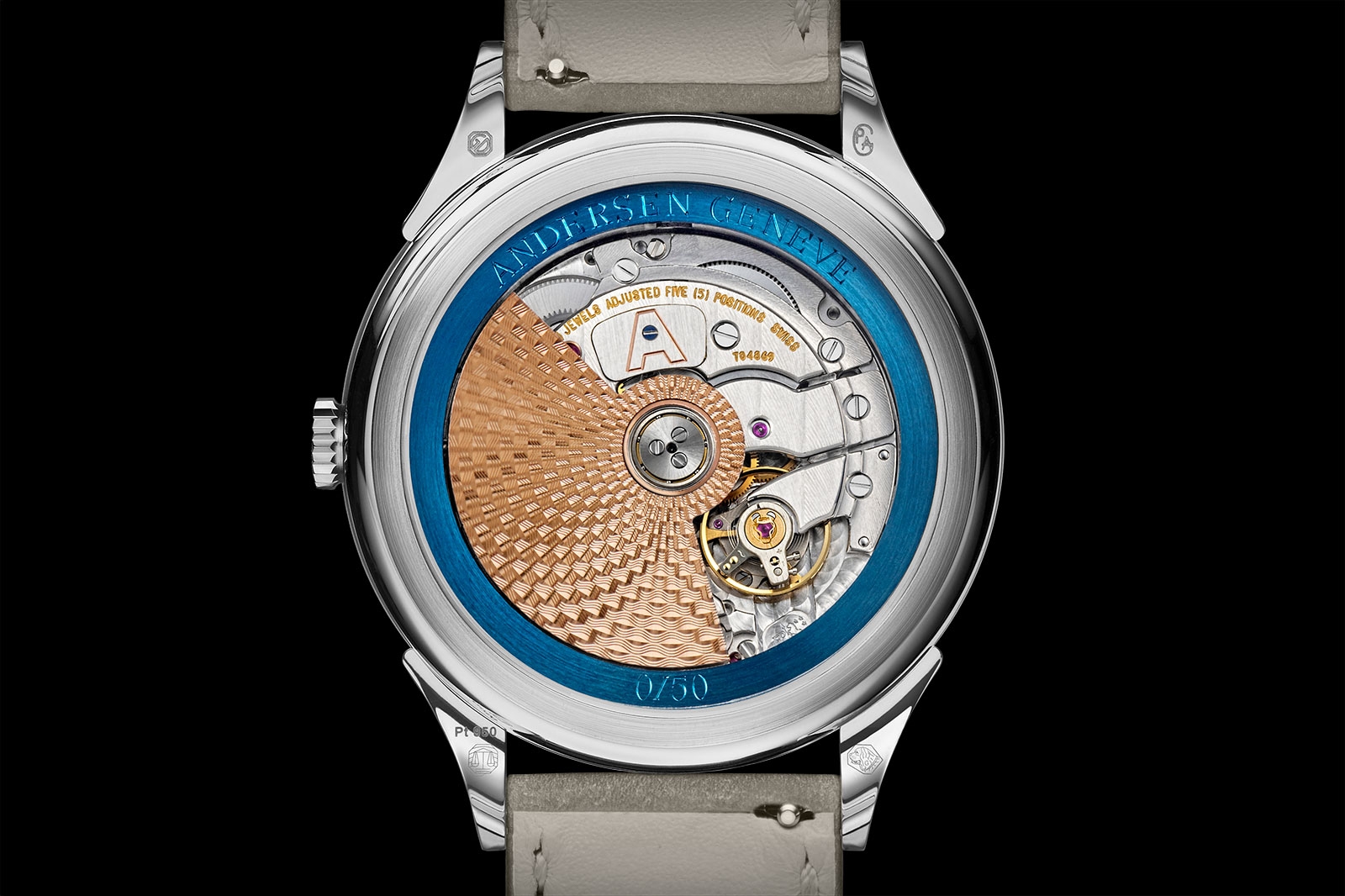 Mặt sau đồng hồ có trang bị kính sapphire để lộ bộ máy Frédéric Piguet cal. 1150, có hai thùng cót, đảm bảo khả năng dự trữ năng lượng trong vòng 70 giờ. Được trang trí nội bộ ở xưởng chế tác Andersen Genève, bộ máy có mô-đun giờ nhảy đặt ở bên trên. Bên cạnh Côtes de Genève thông thường và vát cạnh, bộ máy cũng được trang trí bằng rotor vàng hồng 18k đã được hoàn thiện bằng họa tiết guilloche thủ công truyền thống. Ngoài ra, một tấm bảng nhỏ khắc chữ “A” của Andersen được thêm vào để khẳng định tên tuổi thương hiệu. Theo thông lệ ở nhiều mẫu đồng hồ Andersen Genève sẽ có sự xuất hiện của “BlueGold” 21k có màu xanh lam. Đây là một hợp kim vàng được tạo ra thông qua quá trình xử lý nhiệt. Vòng vàng “BlueGold” này sẽ được khắc thủ công cả tên thương hiệu cũng như số sê-ri.