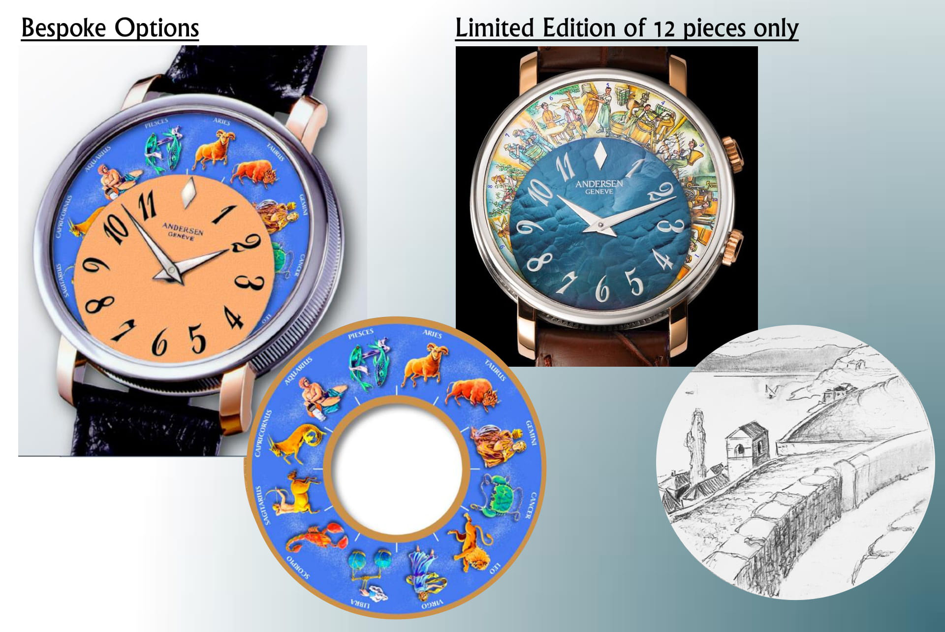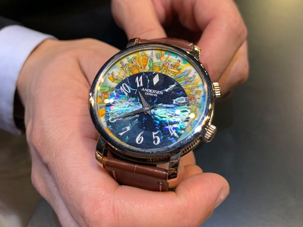 Mẫu đồng hồ Andersen Geneve Vita Vinum sở hữu tới hai mặt số lồng vào nhau, mỗi mặt số lại có một tính năng riêng biệt. Mặt số nền phía sau có 12 bức tiểu họa được vẽ thủ công, lấy cảm hứng từ cuốn sách dạy chế tác rượu của Thụy Sĩ, tương ứng với đó là 12 tháng trong năm. Mỗi khi mặt số này chuyển động, lần lượt 12 bước trong quá trình chế rượu sẽ được hiện ra.