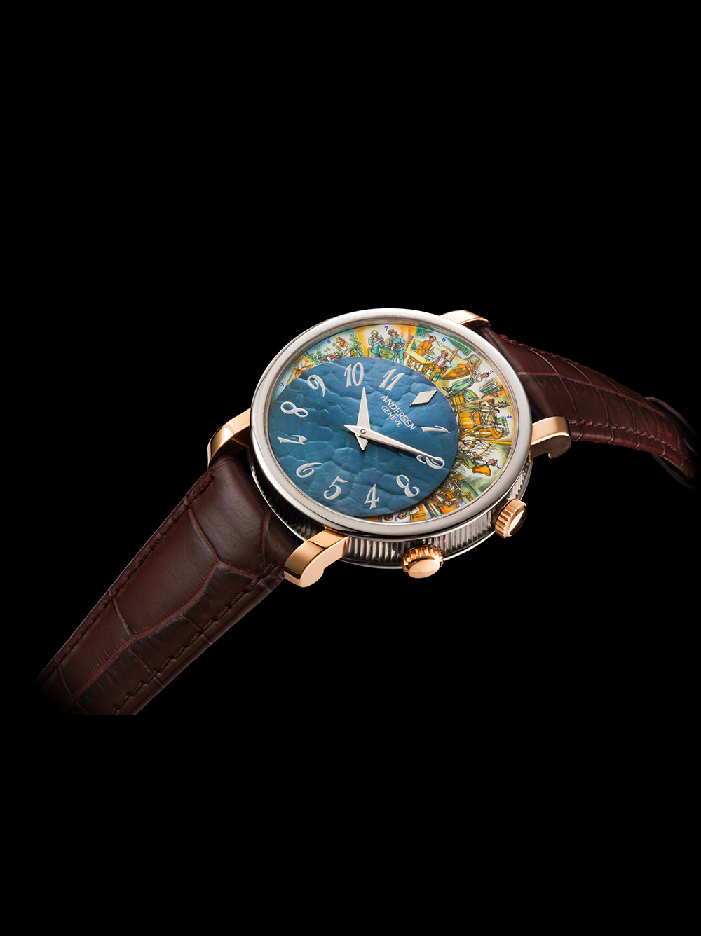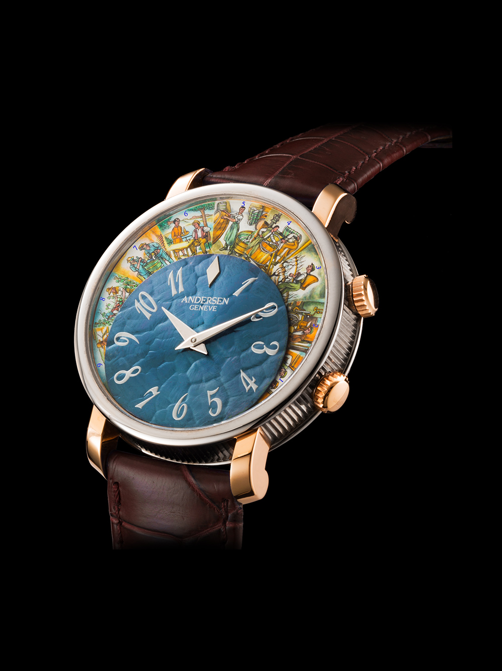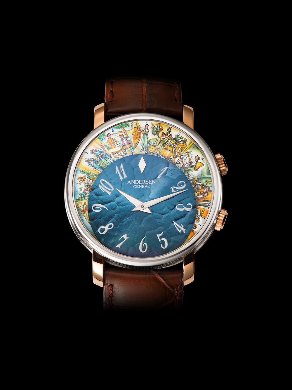 Phía trên 12 bức tiểu họa này chính là mặt số chính đồng hồ, được làm từ chất liệu vàng xanh 21K độc quyền của Andersen Geneve và được hoàn thiện bằng những họa tiết Guilloche Tapisserie. Với những hoa văn này, mặt số sẽ biến đổi tùy vào từng góc sáng khác nhau, tùy từng cường độ sáng khác nhau. Chất liệu vàng xanh chứa 87% vàng khối và 13% còn lại là sắt, khi nung lên sẽ có một màu xanh rất đẹp mắt và quyến rũ.