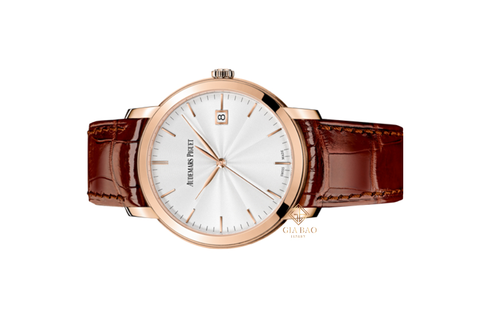 Càng nối dây cũng sẽ được đánh bóng để đem lại khả năng phản chiếu ánh sáng tốt nhất. Kết nối với đó vẫn là bộ dây da cá sấu quen thuộc, được may thủ công từ phần da bụng cá sấu với những đường vân rõ ràng, vuông vức nhất. Bộ khóa gập đi kèm dây được chế tác từ vàng hồng nguyên khối, tạo hình với hai chữ cái AP là viết tắt của tên thương hiệu.