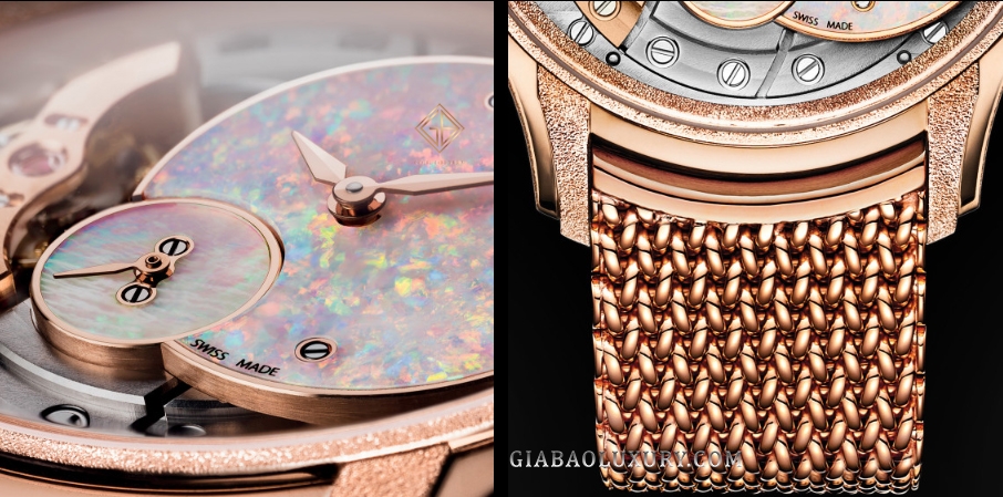 Mặt số đồng hồ dạng Skeleton được bài trí rất đặc biệt và khéo léo. Một phần những cầu máy hoàn thiện xước được show ra cho phép chúng ta chiêm ngưỡng những ốc vít được đánh bóng đẹp mắt. Phần cầu đỡ bánh xe cân bằng Balance wheel được làm từ vàng góc 9 giờ, khác hẳn vị trí ở những cỗ máy thông thường là góc 6 giờ. Về hiển thị giờ phút, chúng ta có một nền mặt số với chất liệu khảm trai hồng rất nữ tính, kế đến là kim giây nhỏ cũng được đặt trên nền mặt số tách biệt. Về tổng thể mặt số, nếu để mô tả chi tiết chúng tôi có thể cảm nhận đến cả 1000 từ vì đây là mặt số khác biệt với đa phần những chiếc đồng hồ nữ chúng ta thường thấy - “đẹp, độc, lạ và dị”.