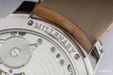 Chiếc đồng hồ Audemars Piguet Millenary Hand Wound mang mã Ref: 77247BC.ZZ.A813CR.01 sở hữu mặt số lộ máy cùng thiết kế lệch tâm vô cùng độc đáo. Mặt số chỉ giờ được đặt lệch hẳn sang góc 3 giờ với các cọc số La Mã cực kì cổ diển. Riêng kim giây lại được đặt riêng mặt số phụ hướng vị trí 7h. Thêm một chi tiết cách điệu dễ nhận thấy ở vị trí 9h là cầu nối bằng vàng của đồng hồ và bánh lắc, ngoài việc xem giờ bạn có thể xem bộ bánh lắc chuyển động khi đồng hồ vẫn còn năng lượng.