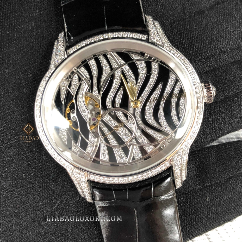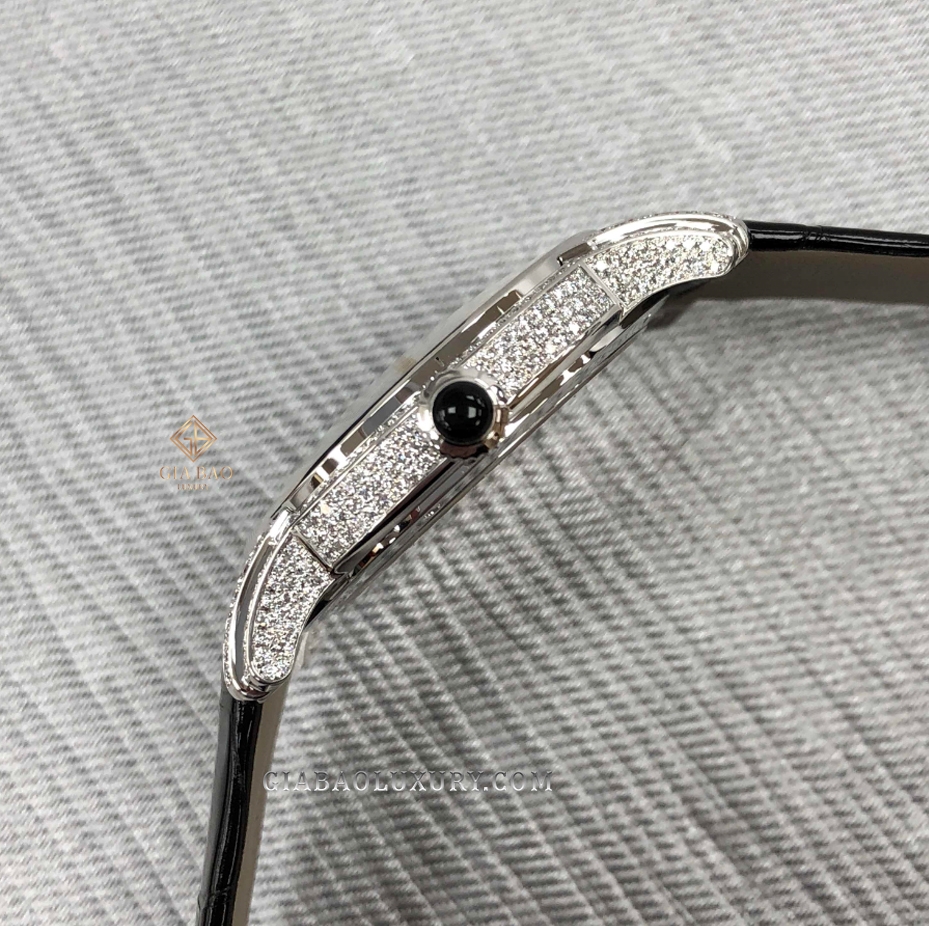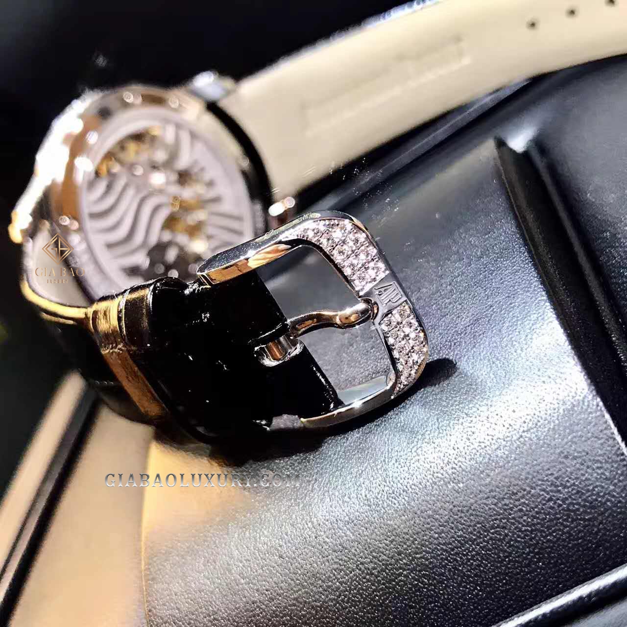 Tạo nên giá trị lớn cho Audemars Piguet Millenary 77249BC.ZZ.A102CR.01 là 438 viên kim cương brilliant cut được trí khắp bộ vỏ, vành bezel đến khóa cài đồng hồ. Bộ vỏ kích thước 39,5mm x 9,8mm có tổng số 1,93 carat kim cương, và mặt số chứa đựng khoảng 0,43 carat kim cương. Đặt tại núm điều chỉnh là một viên đá cabochon mã não màu đen huyền bí, phối hợp ăn ý cùng dây đeo da cá sấu màu đen cao cấp.