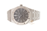Không quá nổi bật, mặt số màu xám của mẫu đồng hồ Đồng Hồ Audemars Piguet Royal Oak 15400ST.OO.1220ST.04 mang đến cảm giác trung tính và hiện đại. Nổi trội bên dưới mặt kính sapphire phẳng và được phủ lên lớp chống loá cao cấp, hệ vân hình vuông dựng nổi Grande Tapisserie đã được hoàn thiện kiểu chải tia bắt mắt. Từng cọc số đều làm từ vàng trắng và được đính nổi chuẩn xác thủ công đem đến hiệu ứng thị giác tuyệt vời. Chiếm một phần diện tích ở góc 3 giờ là ô cửa sổ báo ngày nhỏ bé. Và như một lẽ dĩ nhiên, logo thương hiệu được đặt góc 12 giờ đồng hồ, bên dưới cọc số kép. Tại trung tâm của những cọc số và bộ kim đồng hồ trên chiếc Royal Oak 15400ST.OO.1220ST.04, nhà sản xuất có phủ thêm chất phát quang màu trắng để tăng khả năng theo dõi thời gian của người đeo.