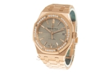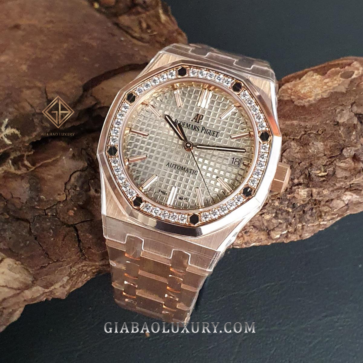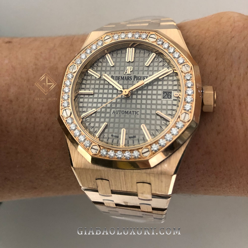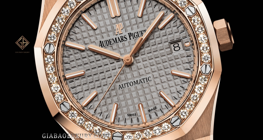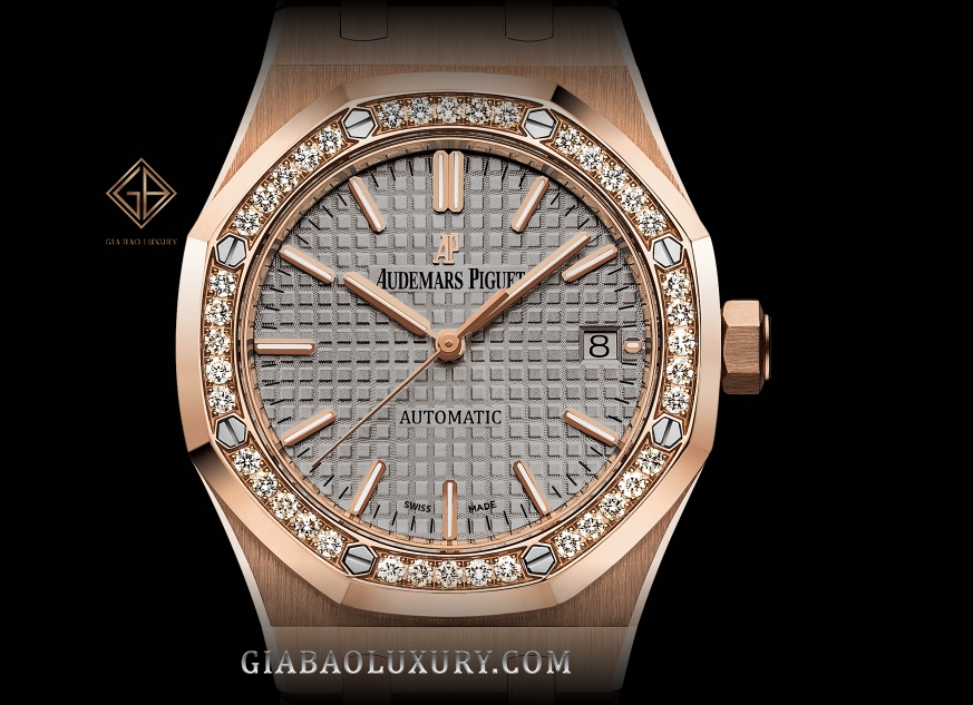 Sở hữu tông màu vàng hồng ấm áp, tạo tác làm từ vàng hồng nguyên khối có bề mặt chải xước tinh tế xen kẽ các cạnh vát bóng bẩy có khả năng phản xạ ánh sáng mặt trời khác nhau vô cùng cuốn hút và hấp dẫn thị giác. Audemars Piguet Royal Oak Automatic 15451OR.ZZ.1256OR.02 kế thừa vẻ đẹp trường tồn của Royal Oak huyền thoại là sáng tạo của nhà thiết kế Gérald Genta với điểm nhấn là vành bezel bát giác được nạm kim cương xa xỉ càng tăng thêm độ hoàn mỹ, lấp lánh trên cổ tay người đeo.