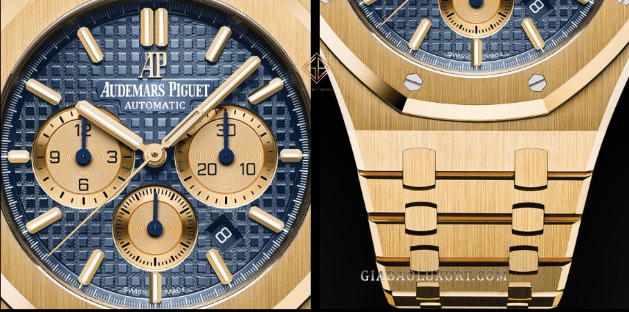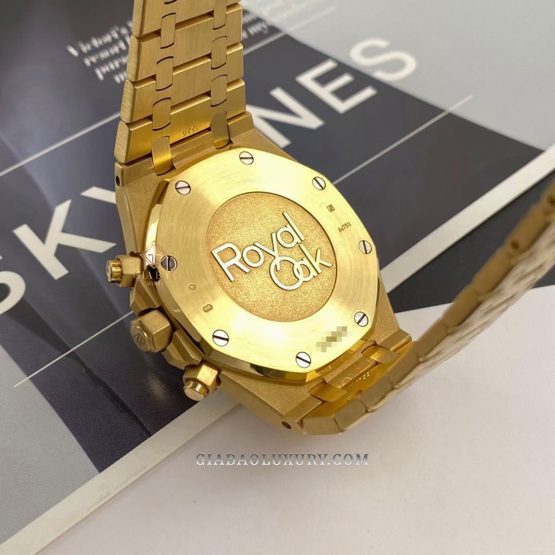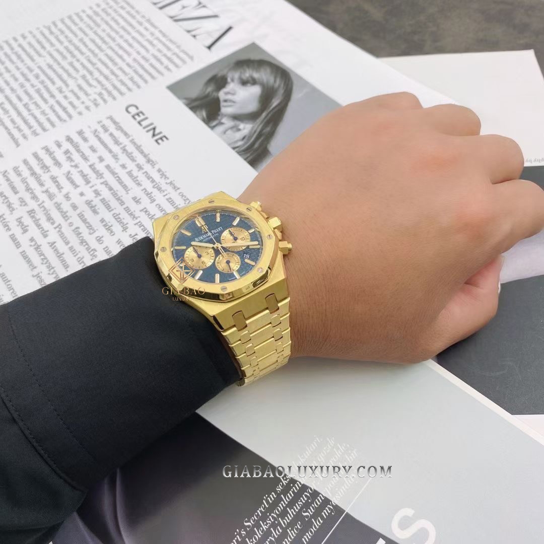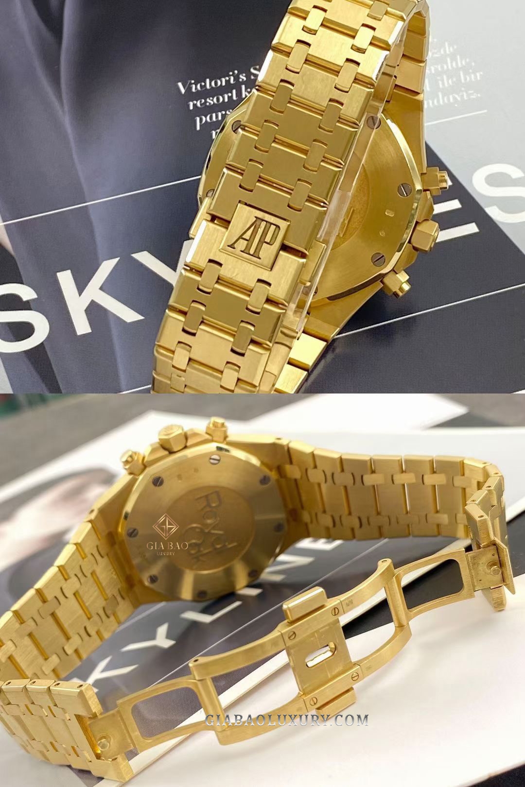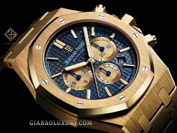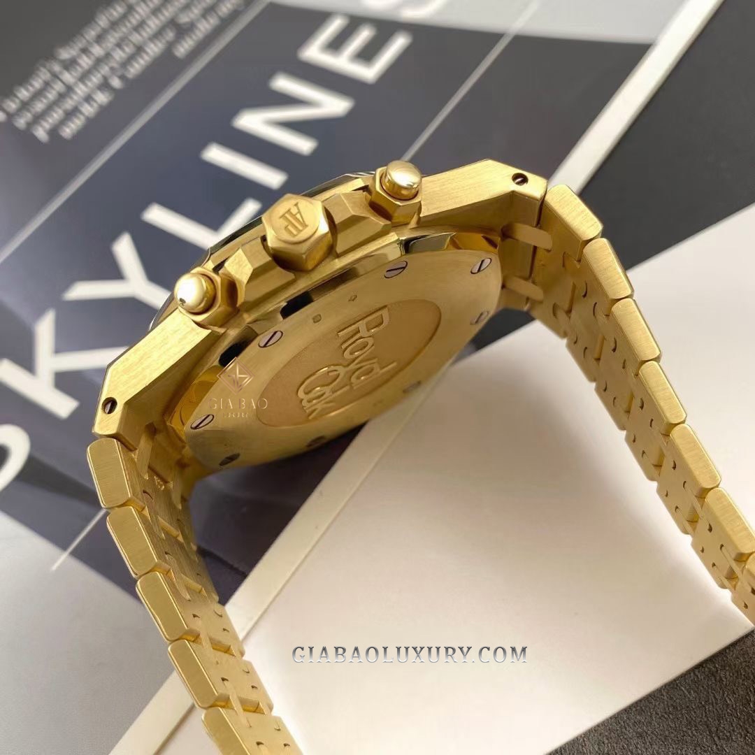 Có mặt tại Gia Bảo Luxury ngày hôm nay, chiếc đồng hồ Audemars Piguet Royal Oak Selfwinding Chronograph 26331BA.OO.1220BA.01 làm từ vàng 18k nguyên khối hứa hẹn là món phụ kiện đẳng cấp dành cho quý ông Việt. Kế thừa những đặc trưng thiết kế của bộ sưu tập huyền thoại, tạo tác sở hữu ngoại hình mạnh mẽ, sang trọng và nổi bật. Đó là màu vàng Gold quý tộc, là bề mặt khung vỏ được chải xước tỉ mỉ, cẩn thận thể hiện trình độ gia công chuyên nghiệp cùng các cạnh vát được đánh bóng chỉn chu tạo hiệu ứng phản xạ cực kỳ ấn tượng.