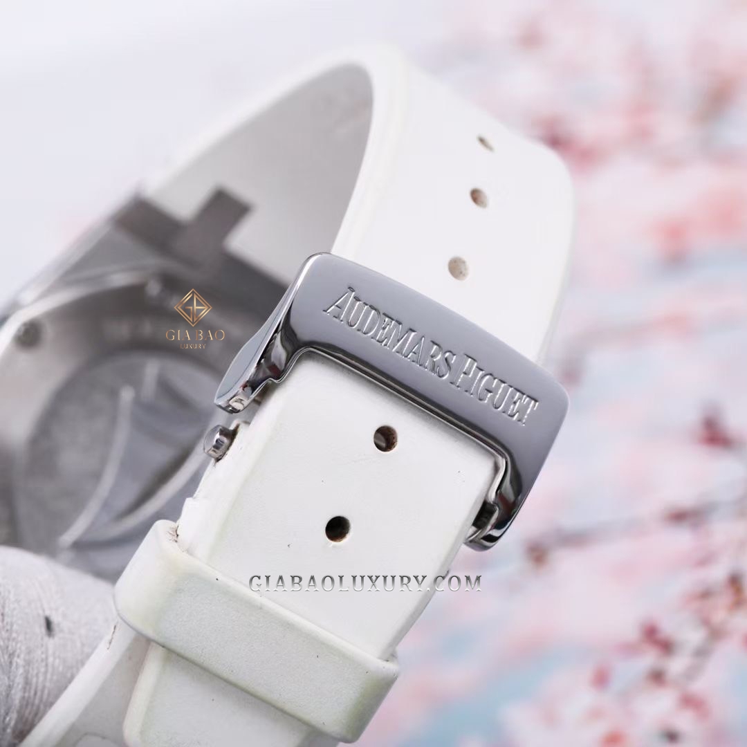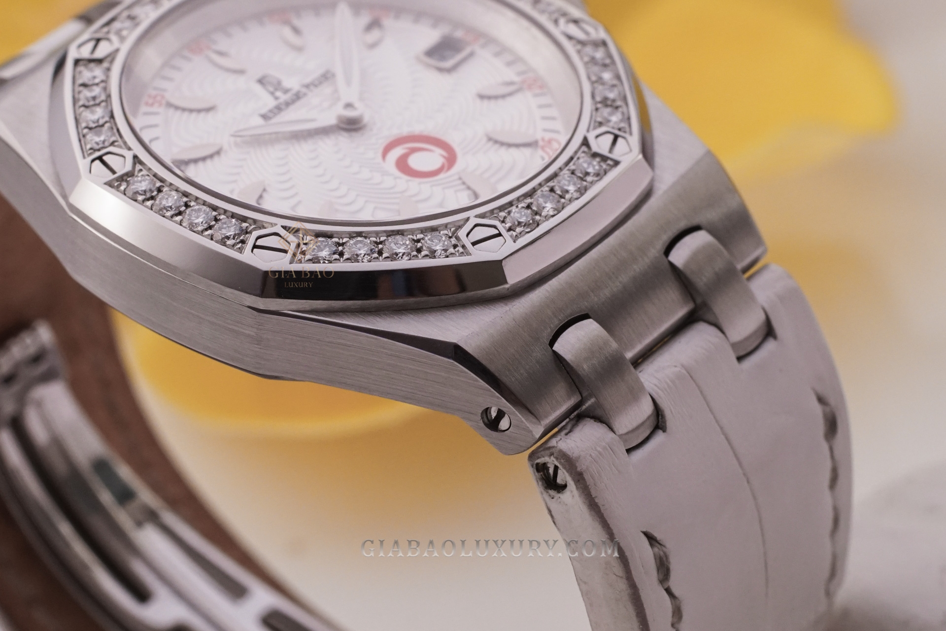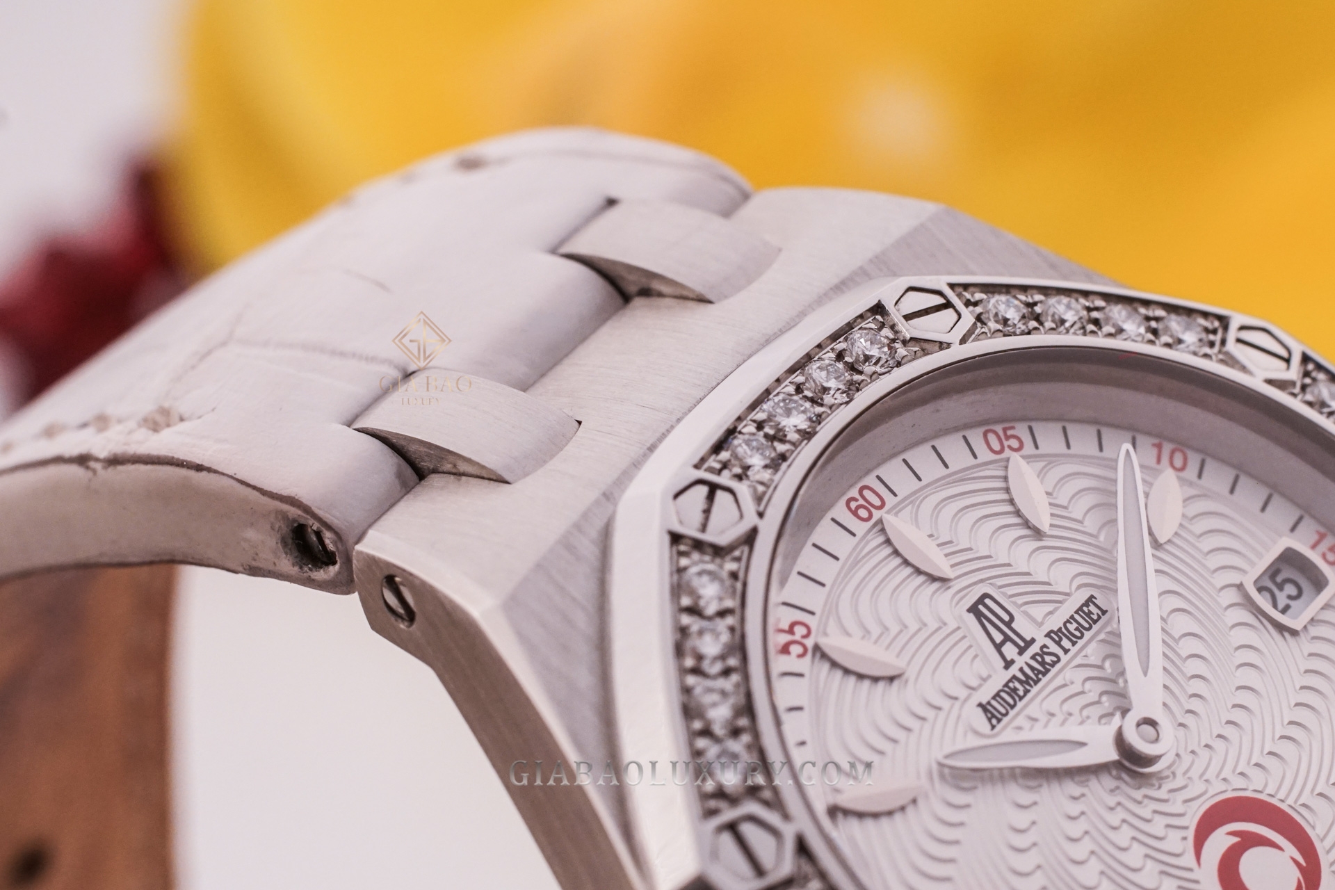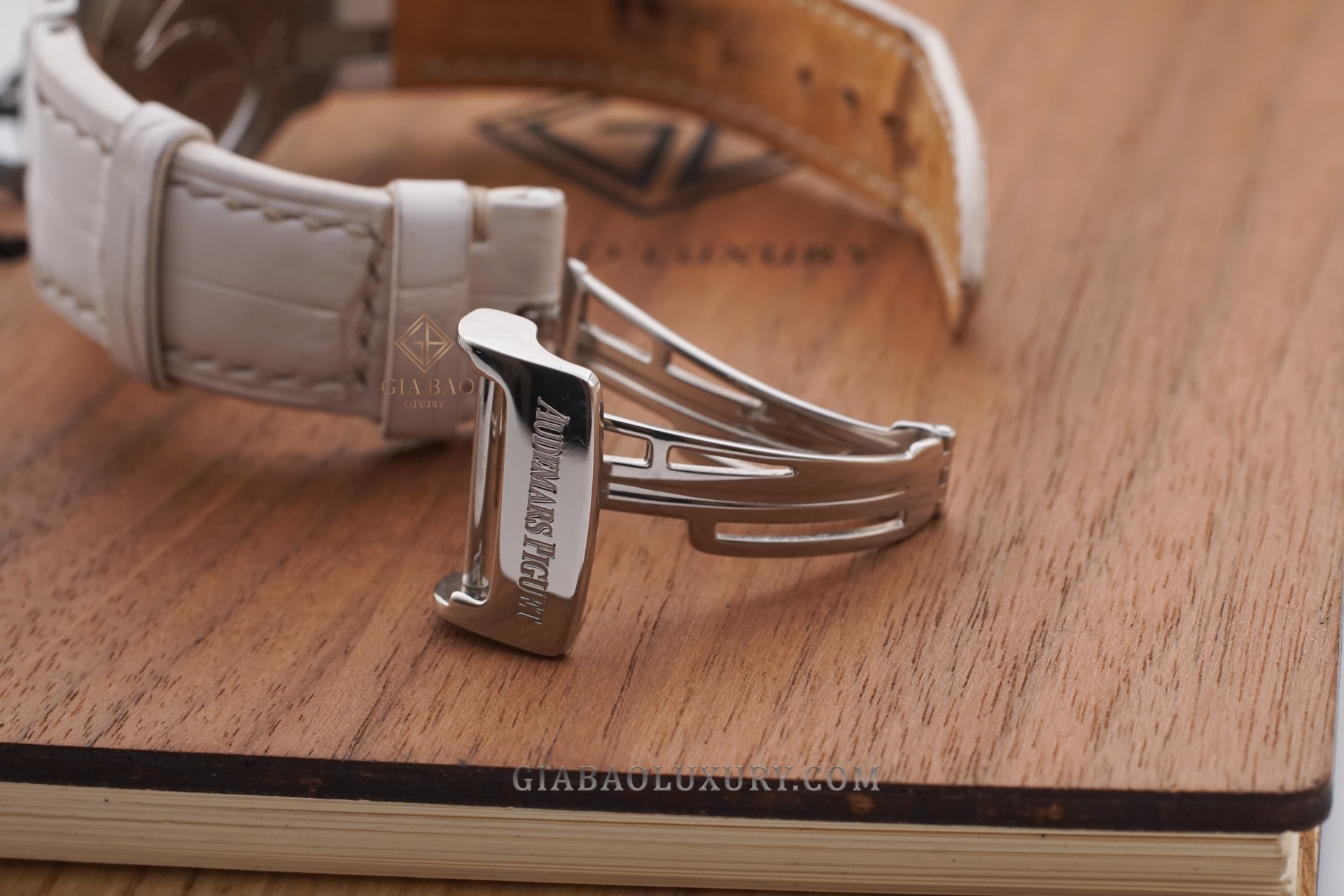 Thay vì bộ dây thép như thiết kế truyền thống của dòng Royal Oak, chiếc đồng hồ này sử dụng dây da cá sấu để tạo cảm giác mềm mại với cổ tay người phụ nữ. Bộ dây này được cố định bởi khóa bằng thép, được tạo hình chữ “AP” là viết tắt của tên thương hiệu Audemars Piguet.