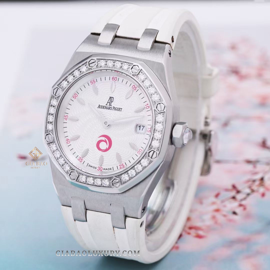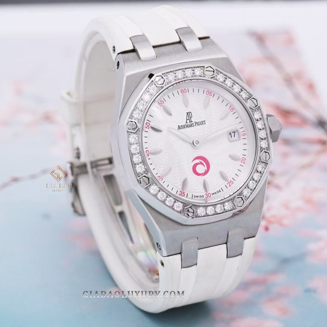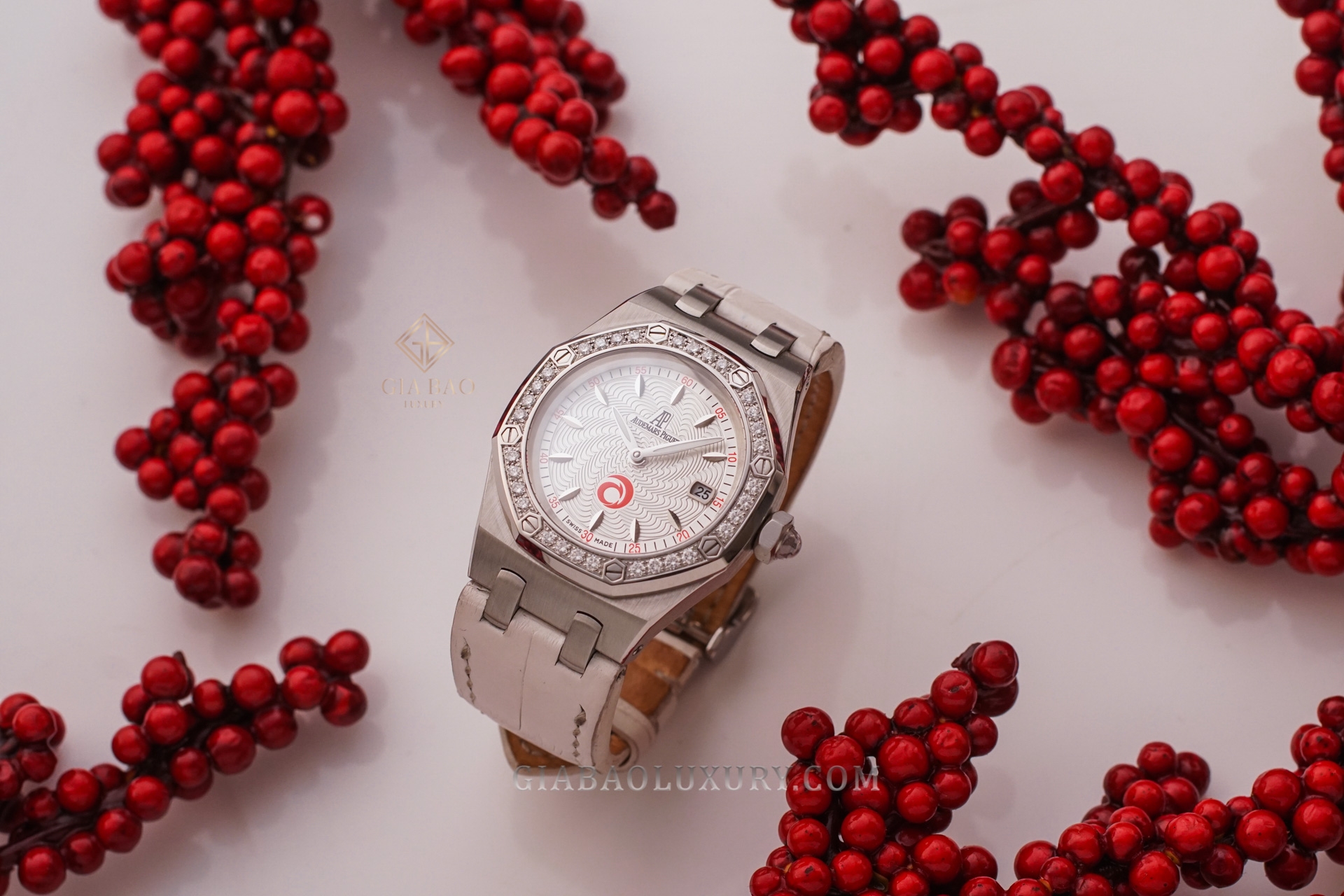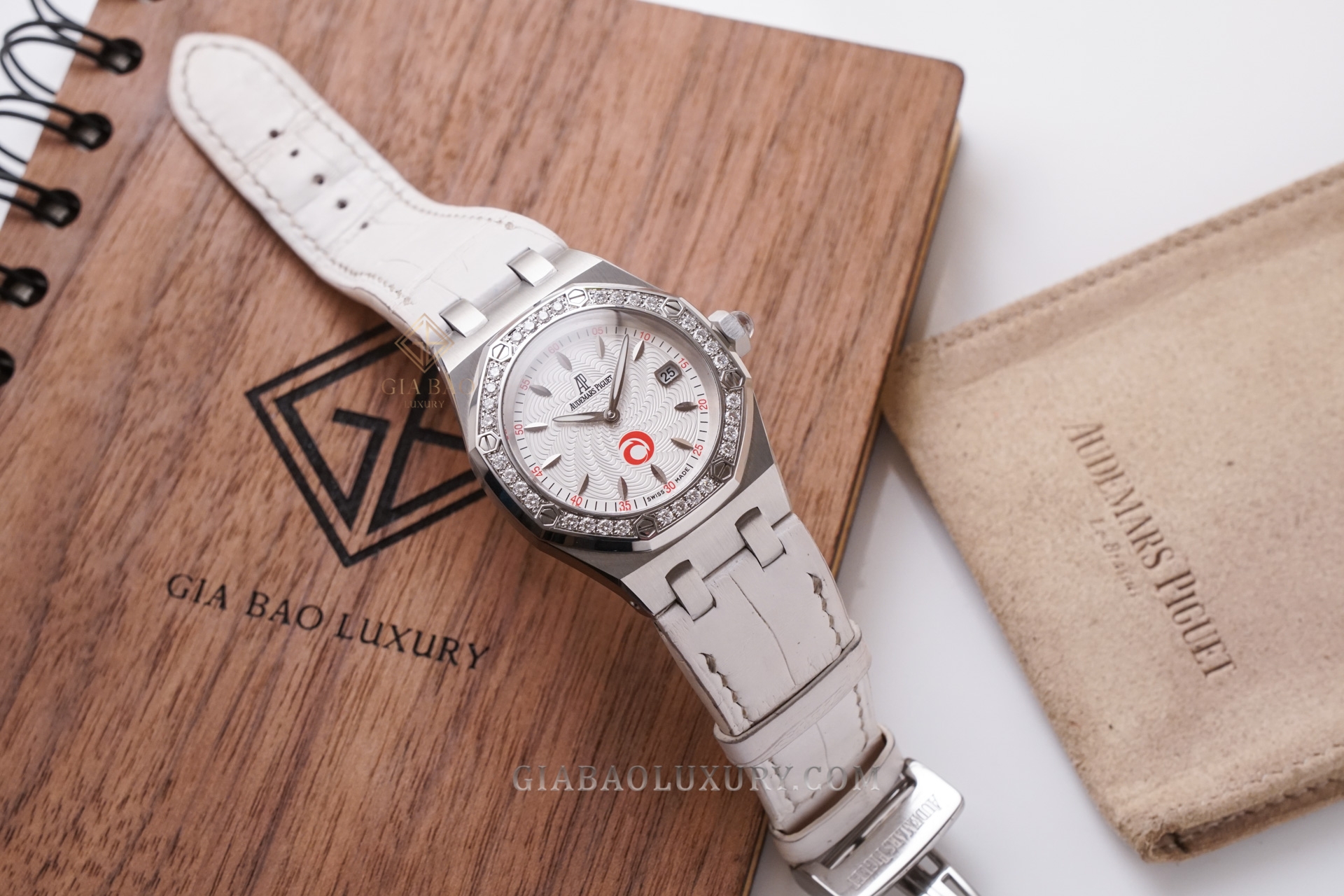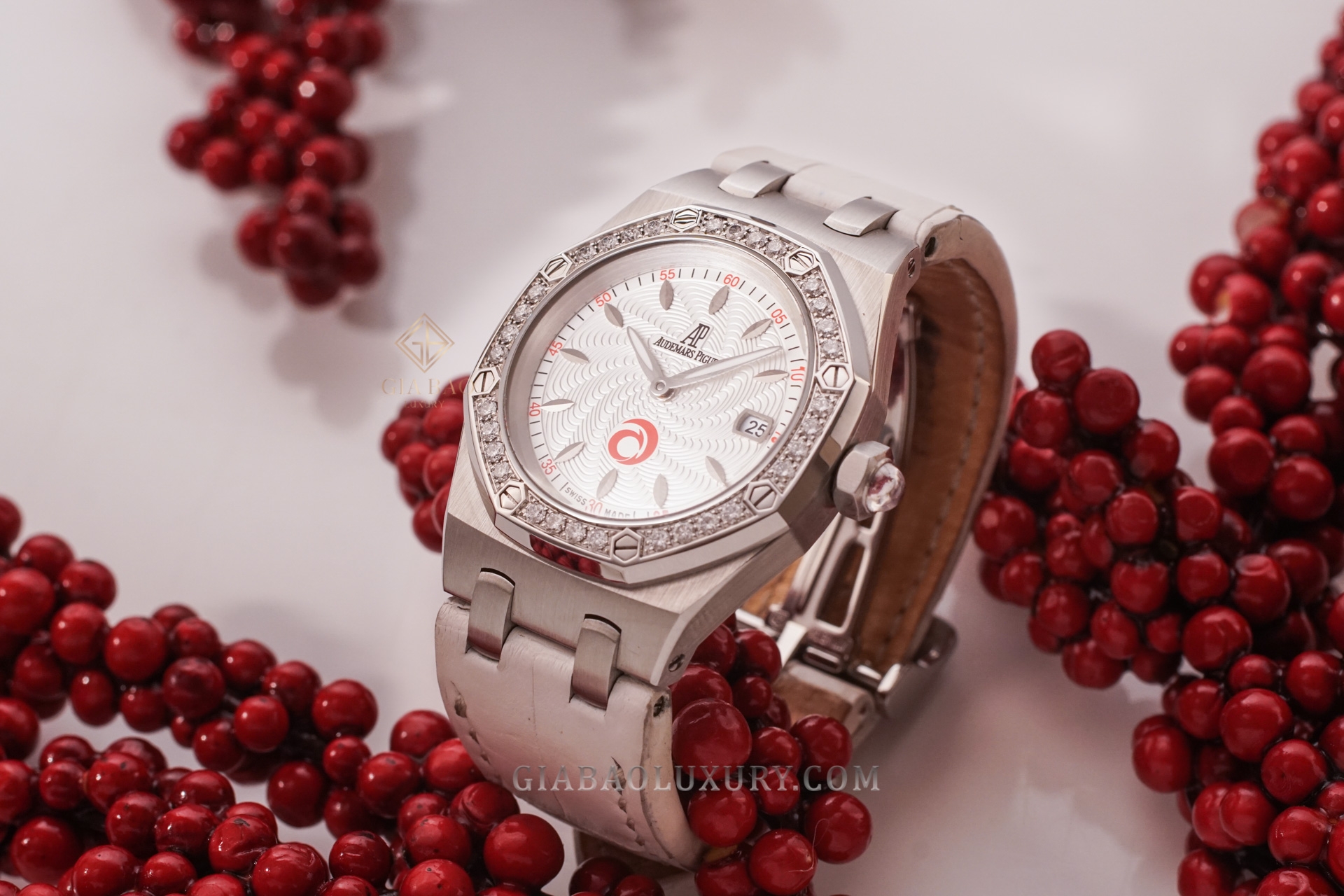 Thay vì bộ dây thép như thiết kế truyền thống của dòng Royal Oak, chiếc đồng hồ này sử dụng dây da cá sấu để tạo cảm giác mềm mại với cổ tay người phụ nữ. Bộ dây này được cố định bởi khóa bằng thép, được tạo hình chữ “AP” là viết tắt của tên thương hiệu Audemars Piguet.