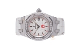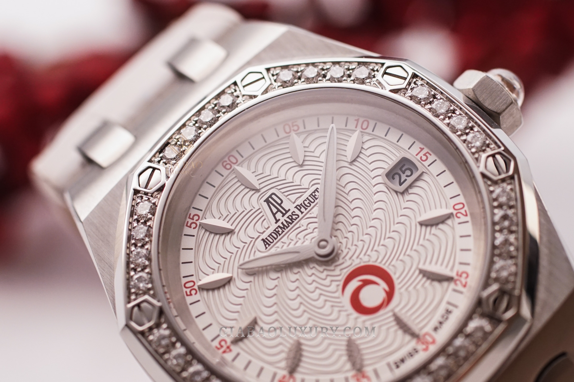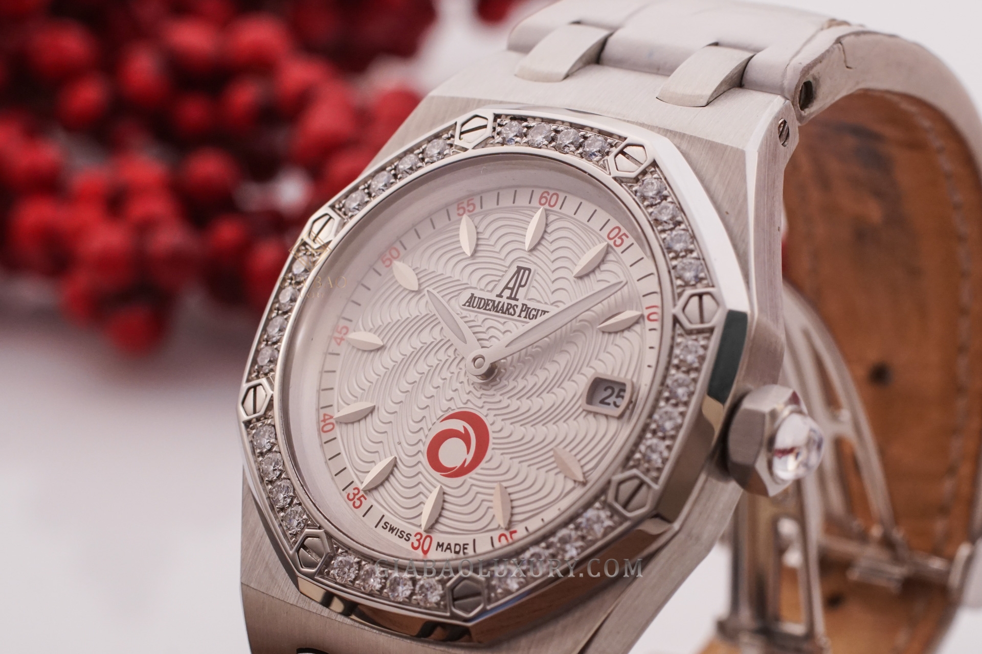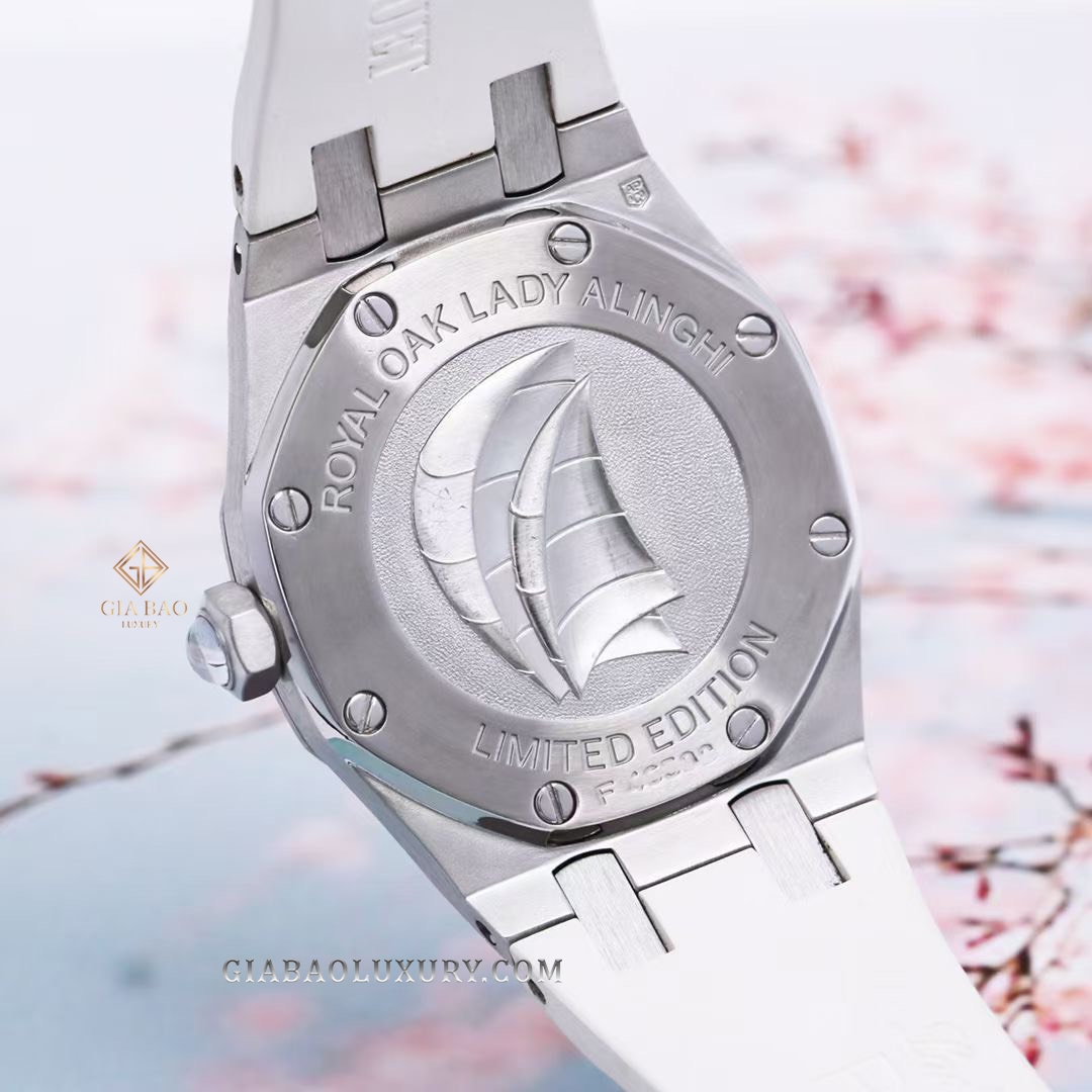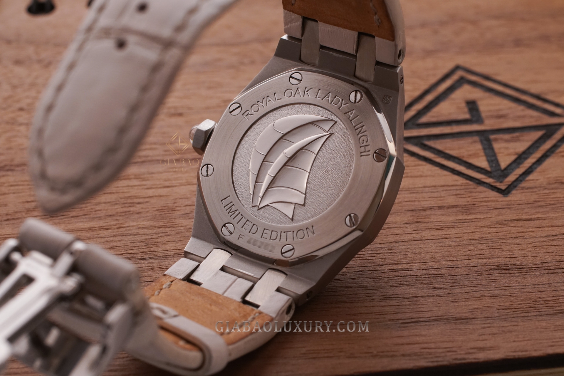 Tuy nhiên, điểm đặc biệt nhất ở đấy chính là chiếc Audemars Piguet Royal Oak ALINGHI 67611ST.ZZ.D012CR.01 được thiết kế dành cho phái nữ. Bộ vỏ đồng hồ có kích thước nhỏ gọn chỉ 33mm (khoảng cách giữa hai đầu càng nối dây là 42mm), được chế tác hoàn toàn từ thép không gỉ. Mặt đáy đồng hồ có chạm khắc biểu tượng thuyền buồm, cùng dòng chữ Royal Oak Lady ALINGHI và số phiên bản giới hạn.