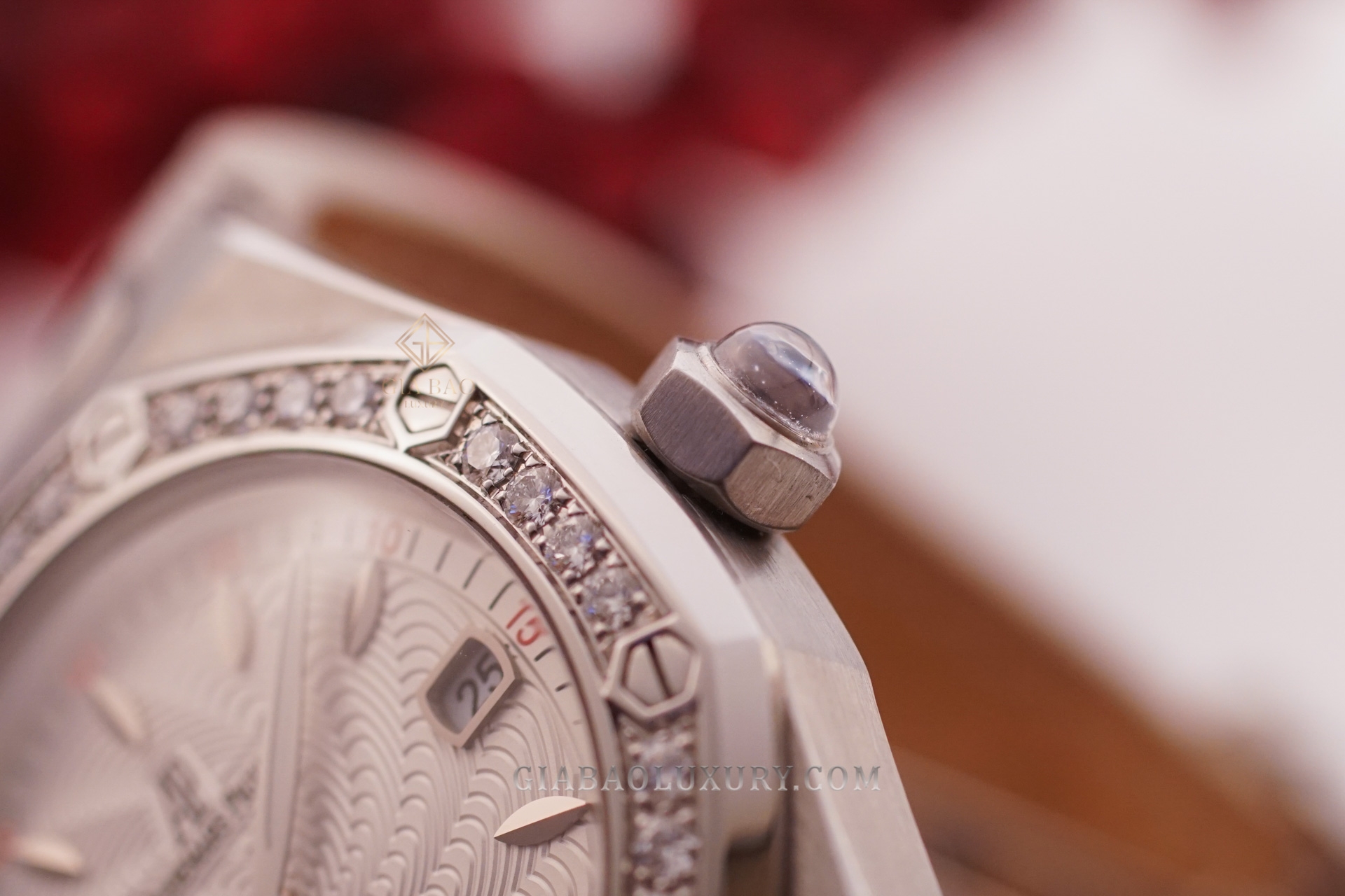 Đan xen với những viên kim cương vẫn sẽ là 8 chiếc đinh vít hình lục giác - thiết kế đặc trưng của bộ sưu tập Royal Oak. Đây là đứa con tinh thần của thiên tài Gerald Genta, đem đến cho người dùng rất nhiều bất ngờ thú vị. Nếu nhìn kỹ, ta có thể thấy rằng những chiếc “đinh vít” kia không thể vặn được, và đó cũng chính là lý do khiến đinh ốc trên Royal Oak luôn được đặt ở vị trí chính xác trên từng góc vành bezel.