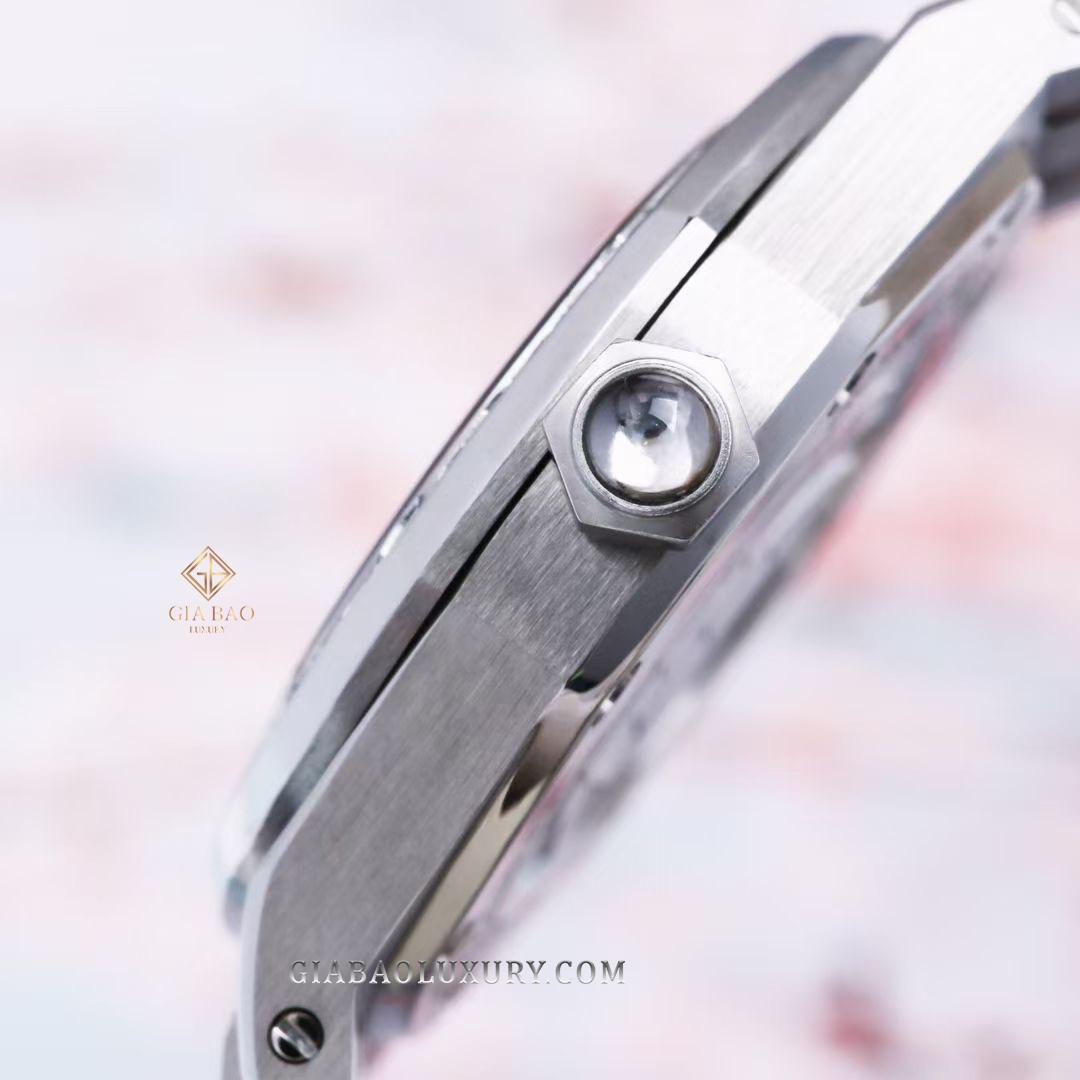 Phần núm chỉnh giờ của chiếc Audemars Piguet Royal Oak ALINGHI 67611ST.ZZ.D012CR.01 cũng được trang trí bởi một viên đá không màu. Tuy nhiên, viên đá được sử dụng trên núm vặn không phải là kim cương. Thiết kế này được cắt theo phong cách Cabochon, với một đầu tròn và một đầu dẹt.