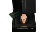 Bên trong bộ vỏ 37mm của thiết kế được nhắc tới này là mặt số trong dáng tròn cũng có tông màu vàng hồng, nhưng được hoàn thiện chải xước với nền vân Grande Tapisserie đặc trưng nhà Audemars Piguet. Nhà sản xuất đã thống nhất tông vàng hồng cho toàn bộ tổng thể thiết kế từ bộ kim, cọc chỉ giờ, logo và nền đĩa báo ngày. Riêng cọc chỉ giờ và bộ kim đã được phủ thêm chất phát quang với màu trắng thanh lịch.![]()