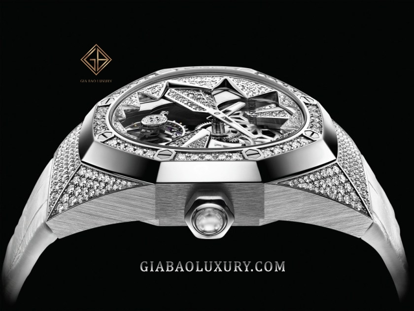 Mặt số được thiết kế theo dạng Skeleton với nền mặt số bằng vàng 18kt nạm kim cương, tạo hình cánh hoa rất đẹp mắt. Tổng cộng có 62 viên kim cương ~ 0.16 carats được sử dụng để hoàn thiện cho mặt số tinh tế và cầu kì này. Góc 6h chính là bộ Tourbillon - đỉnh cao cơ khí trong chế tác đồng hồ cơ học. Đi kèm với đồng hồ sẽ là 2 dây đeo màu trắng, một là dây da cá sấu với những vân da lớn , thứ hai là dây cao su màu màu trắng đúng trend.