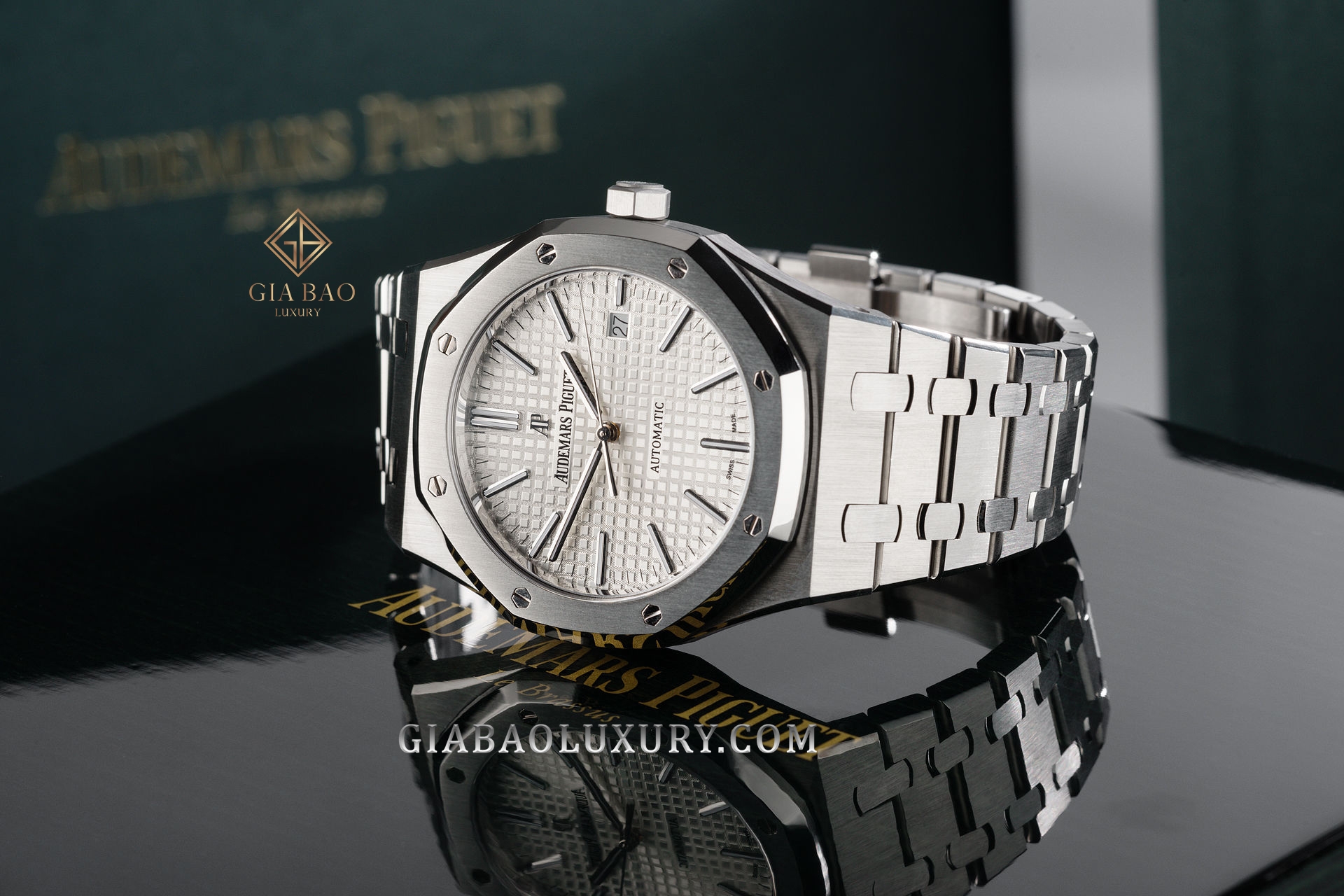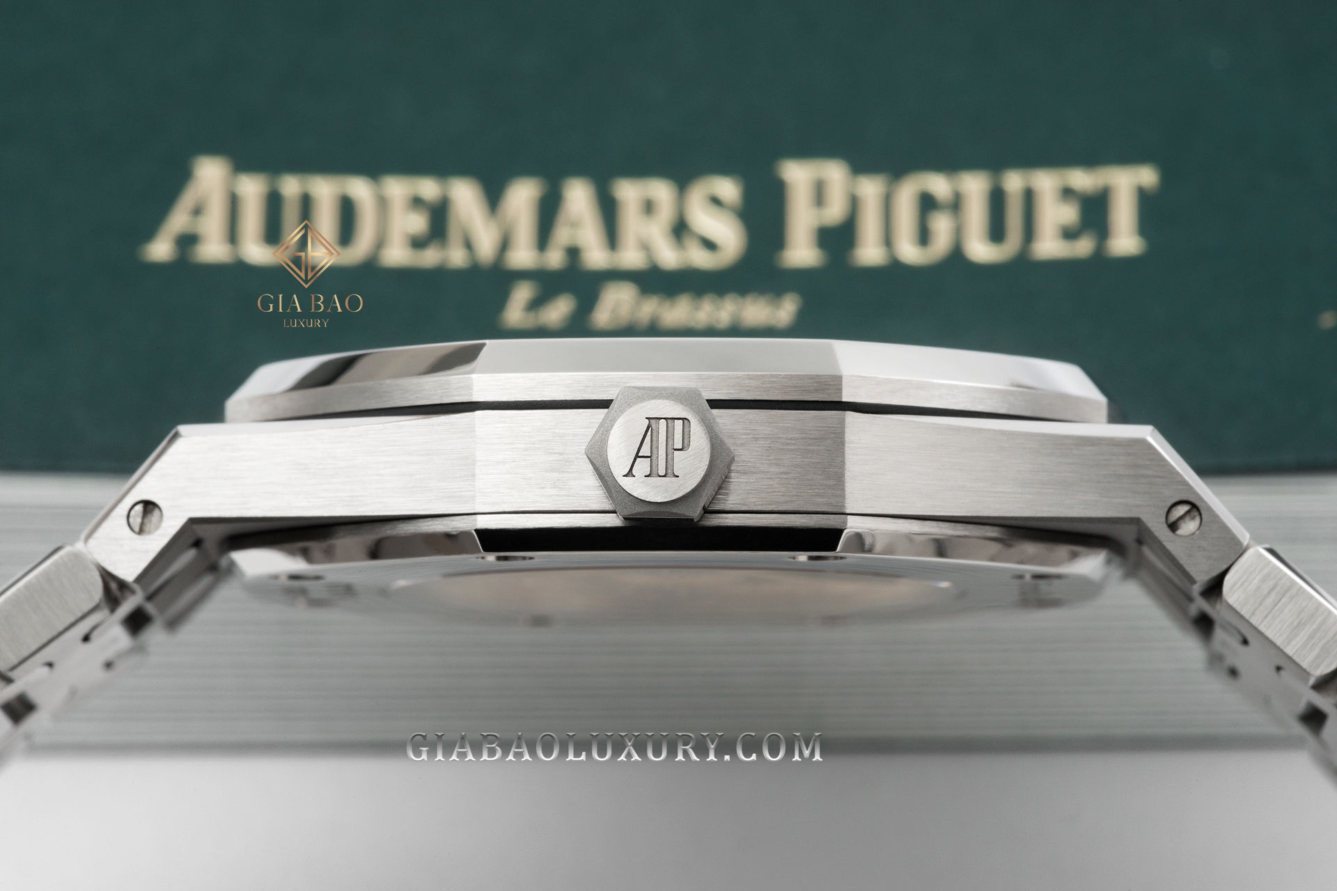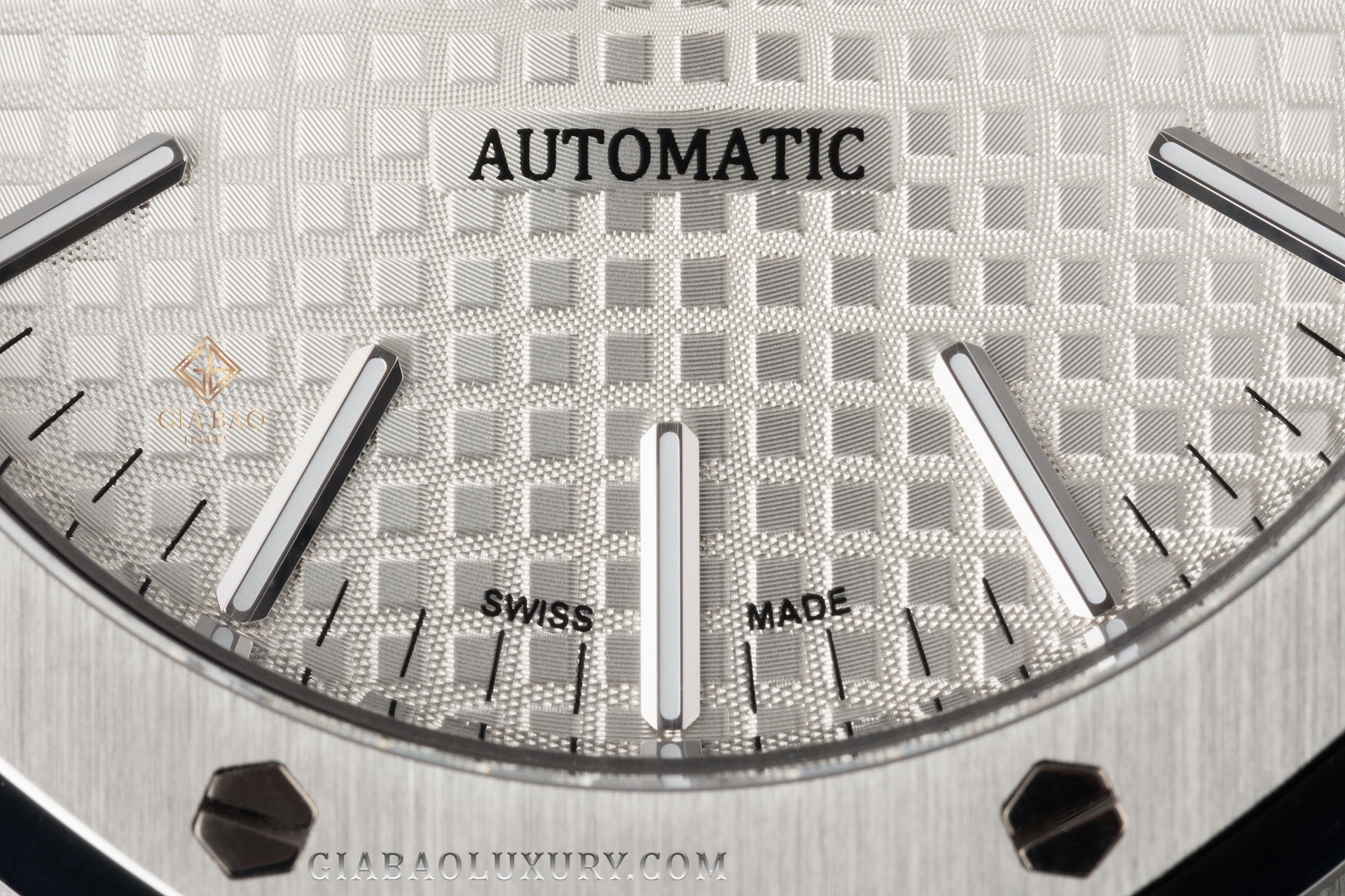 Bên dưới mặt kính sapphire của Audemars Piguet Royal Oak Automatic 41mm là mặt số màu trắng với hệ vân Grande Tapestry hình vuông dập nổi. Hệ vân trắng đơn giản hiện lên tinh tế cùng những cọc chỉ giờ đính nổi bằng vàng trắng đã được đánh sáng bóng, hấp dẫn ánh sáng nhất có thể. Giữa những cọc chỉ giờ là chất phát quang màu trắng cùng tông mặt số xung quanh.