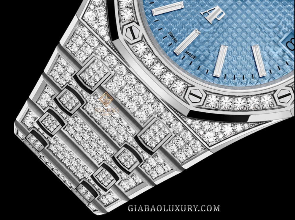 Tất nhiên, những đặc điểm làm nên danh tiếng của dòng Royal Oak vẫn được giữ nguyên. Chúng ta vẫn sẽ có vành bezel bát giác, được cố định bởi những chiếc “đinh vít” được sắp xếp cân đối và đẹp mắt. Cạnh chéo của vành bezel được đánh bóng tinh xảo, đối lập với bề mặt nhấp nhô của kim cương và tạo thêm điểm nhấn cho chiếc đồng hồ.