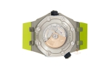 Như đã nói ở trên, mặt số đồng hồ cực kỳ nổi bật với tông màu xanh cốm. Phần nền mặt số vẫn được giữ nguyên phong cách hoàn thiện đặc trưng của dòng Royal Oak Offshore, có những đường vân Mega Tapisserie. Thiết kế này gần giống với Grande Tapisserie của Royal Oak, nhưng có kích thước lớn hơn nhiều.
