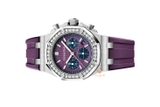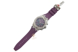 Khi kích hoạt nút bấm 2 giờ, kim giây chronograph mảnh nhất bên trong sẽ chạy quanh mặt số màu tím trong khi thang đo giây ngoài cùng là màu đen cho dễ nhìn. Khi chuyển động trọn vẹn một vòng, kim phút chronograph tại góc 3 giờ sẽ dịch chuyển và khi kim phút hoàn thiện 2 vòng quay, kim giờ chronograph cũng sẽ nhấc mình một nhịp. Riêng kim nhỏ góc 6 giờ đồng hồ sẽ không hoạt động dựa vào sự kích hoạt của hai nút bấm góc 2 và 4h trên bộ vỏ mà nó sẽ phối hợp cùng kim giờ và phút ở trung tâm để chỉ báo thời gian hiện thời. Một ô cửa sổ báo ngày được bố trí tại góc 4h30 trên mặt số.
